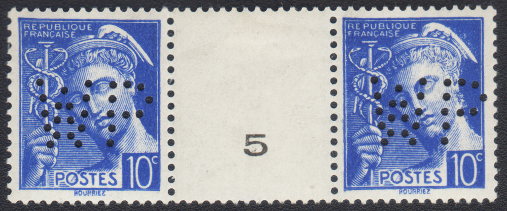 1940 Armia Polska we Francji, parka rozdzielonych miedzypolem czystych znaczków za 10 c. z dziurkowaniem WP - Wojsko Polskie; podczas kampanii 1940 roku nie powstały żadne specjalne polskie znaki czy stemple pocztowe, znane są jedynie zwykłe francuskie znaczki obiegowe z dziurkowaniem WP, naklejane na listy kierowane do obrotu pocztowego na takich samych zasadach jak wojskowych francuskich; rzadkie bo zwykła korespondencja oznaczona stemplami formacyjnymi z zaznaczonym skrótem F.M. (Franchise Militaire) była zwolniona od opłaty pocztowej, na międzypolu lekki ślad po podlepce.
