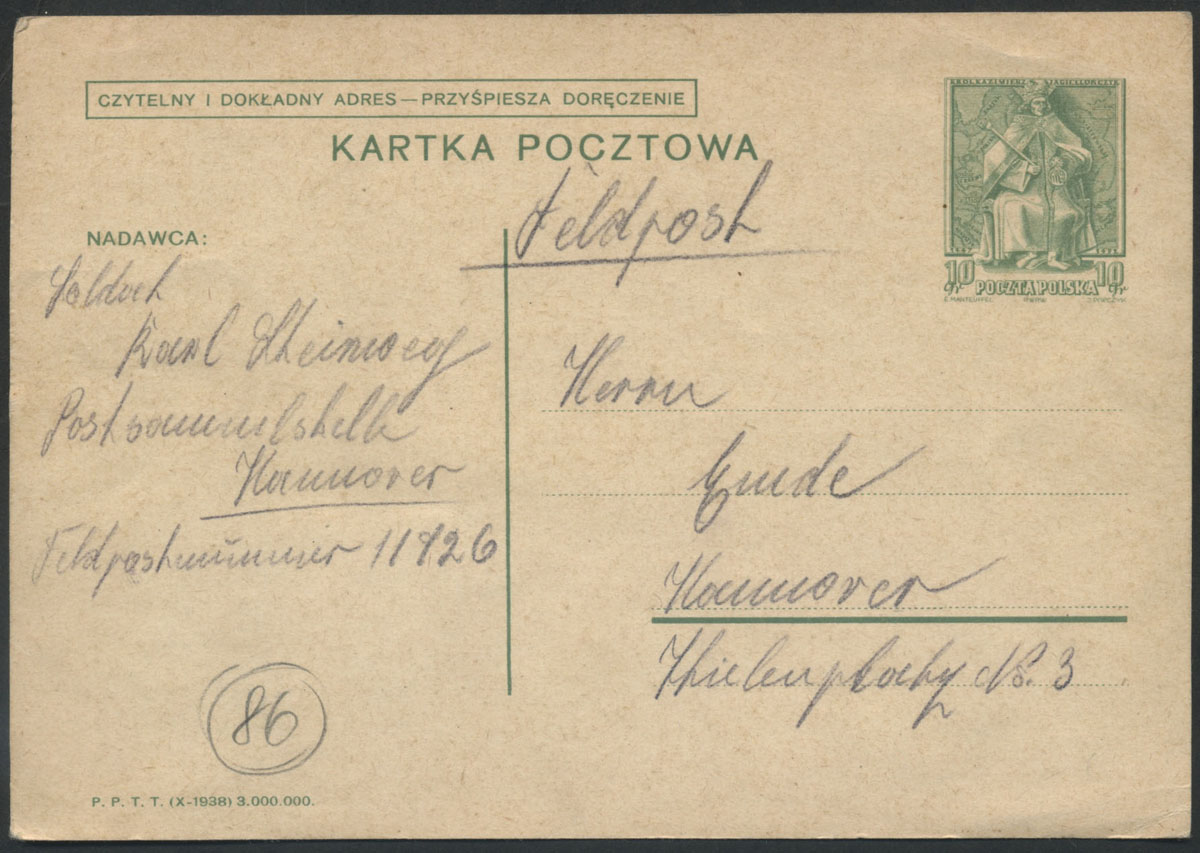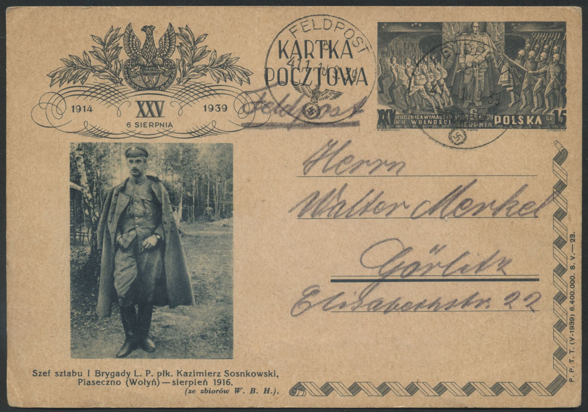 1939 polska całostka użyta jako formularz niemieckiej poczty polowej nadana 18.10.39 z Goslina.
