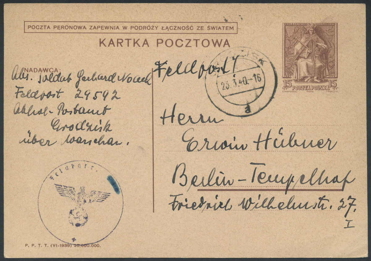 1940 kartka z Grodziska nadana 23.03.40 z niemieckiej poczty polowej do Niemiec na polskiej całostce.