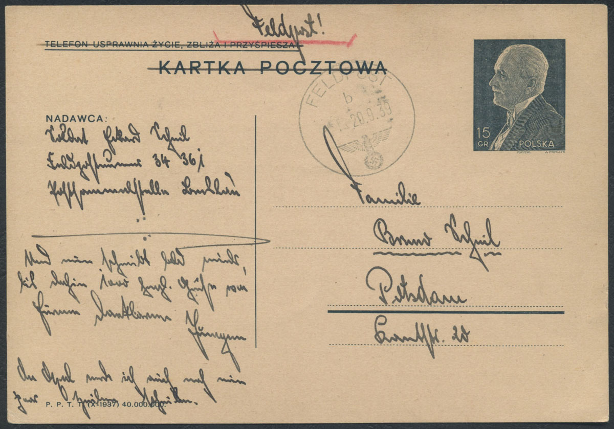 1939 kartka nadana z niemieckiej poczty polowej 20.09.39 do Niemiec na polskiej całostce.