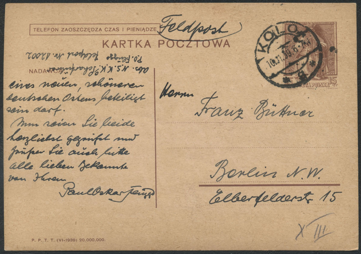 1939 kartka nadana z Koła z niemieckiej poczty polowej 10.11.39 do Niemiec na polskiej całostce.