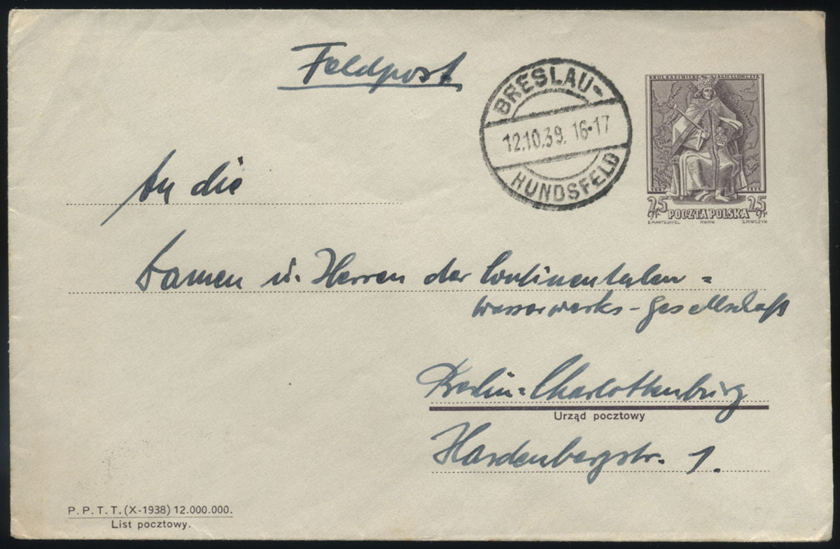 1939 list z Wrocławia nadany 12.10.39 z niemieckiej poczty polowej do Niemiec na polskiej całostce.