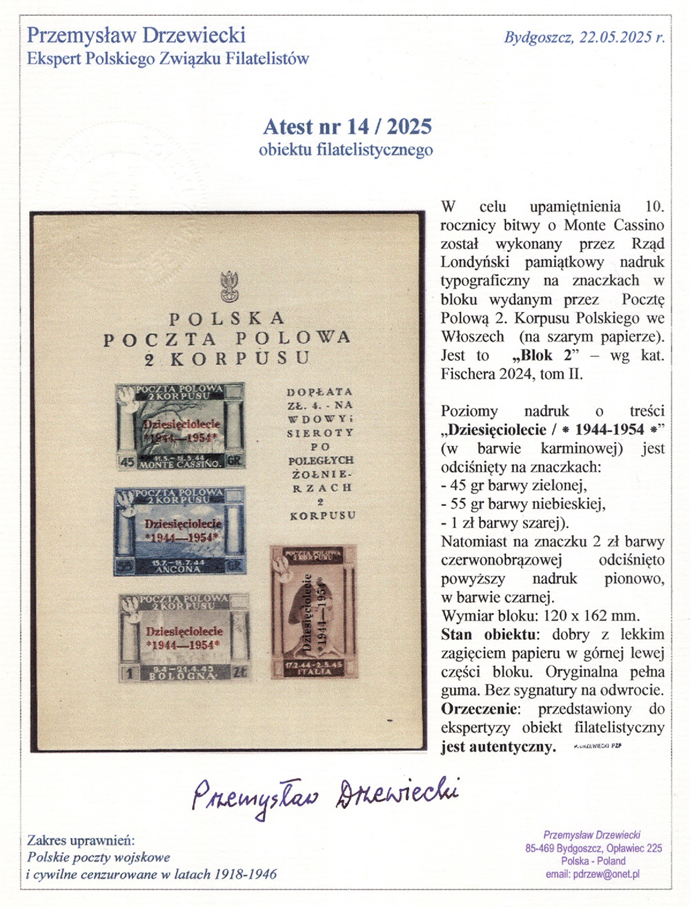 1944/1954 poczta polowa 2. Polskiego Korpusu, blok z nadrukiem z okazji 10. rocznicy bitwy pod Monte Cassino, pełna guma, lekkie zagięcie papieru w górnej lewej części bloku, rzadkie, fotoatest Drzewiecki. | Fi.bl.2 z nadrukiem |