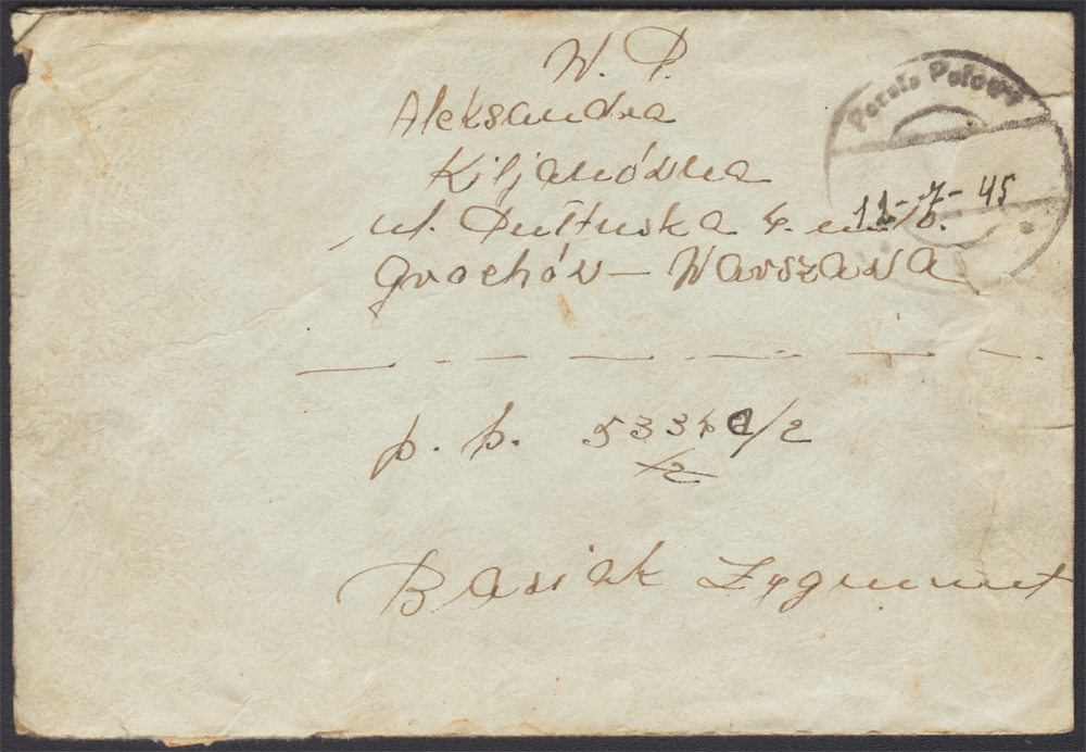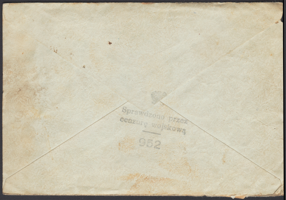 1945 Ludowe Wojsko Polskie, koperta z listem do Warszawy wysłana za pośrednictwem poczty polowej 53340 (3 Zapasowy Pułk Piechoty), "lubelski" datownik nadawczy Poczta Polowa (Fi.200.-) z datą "12-7-45" dopisaną ręcznie, na odwrocie stempelek cenzury wojskowej nr.952; walor w dobrym stanie zachowania. | Fi.6a |