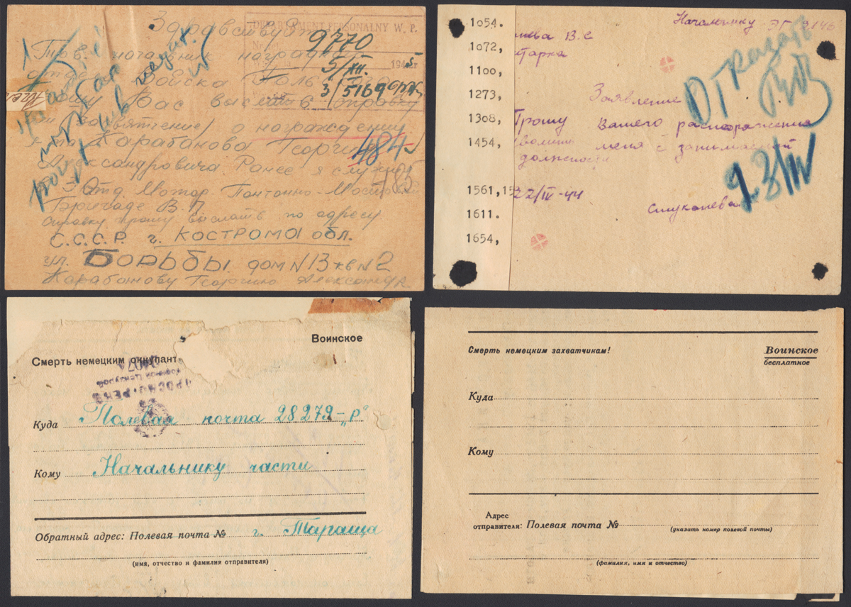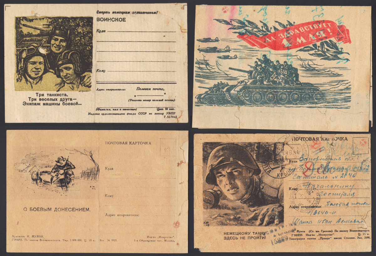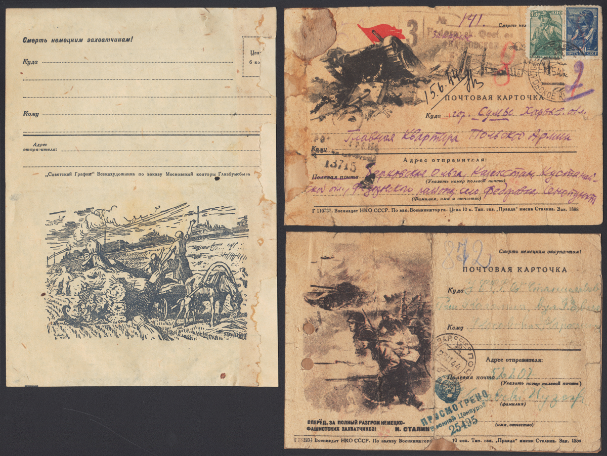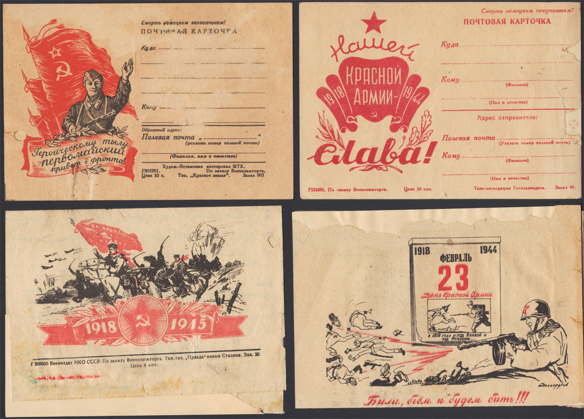1944-45 zestaw 11 całości (4 listowniki i 7 kart) z propagandowymi ilustracjami, wysłanych pocztą lub bez obiegu, ale wykorzystanych jako formularze; dobry/bardzo słaby stan zachowania. | |
