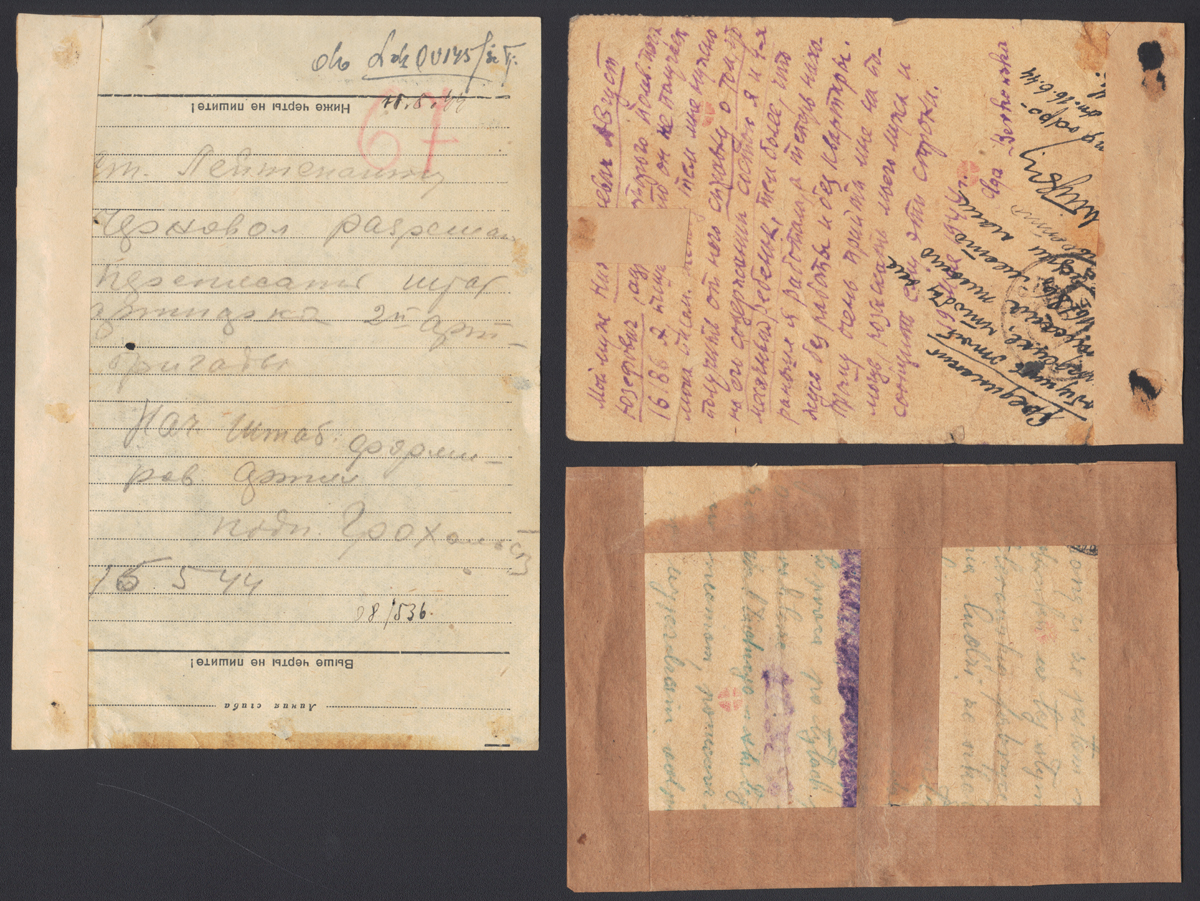 1944 kartka nadana z radzieckiej poczty polowej do Łańcuta, stemple radzieckiej cenzury wojskowej i polskiej nr 1569. | |