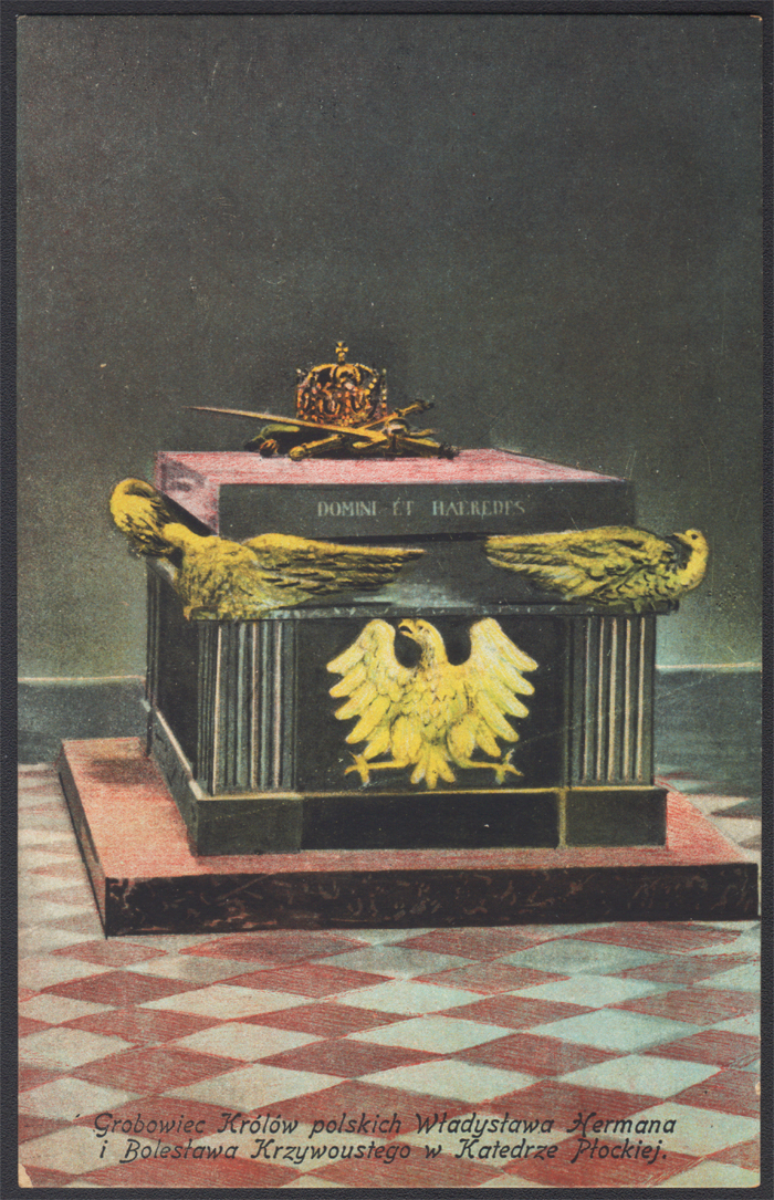 1943 Ludowe Wojsko Polskie, widokówka "Grobowiec Królów polskich Władysława Hermana i Bolesława Krzywoustego w Katedrze Płockiej" z wizerunkiem orła piastowskiego, który stanowił wzorzec dla orła żołnierzy 1 Dywizji Piechoty im.Tadeusza Kościuszki, karta czysta wydana wydana przed 1915 rokiem; bardzo dobry stan zachowania.