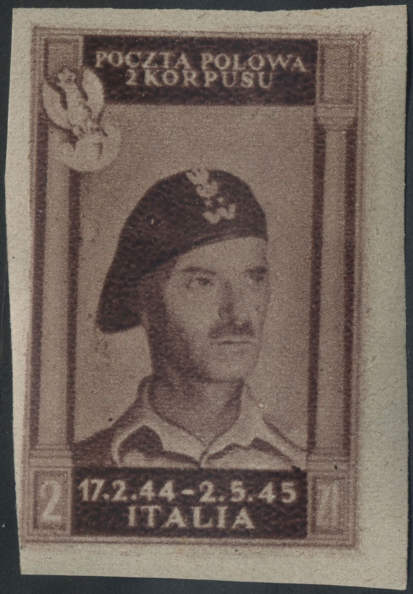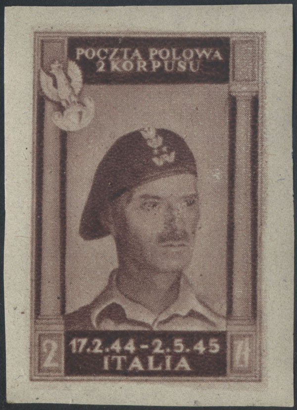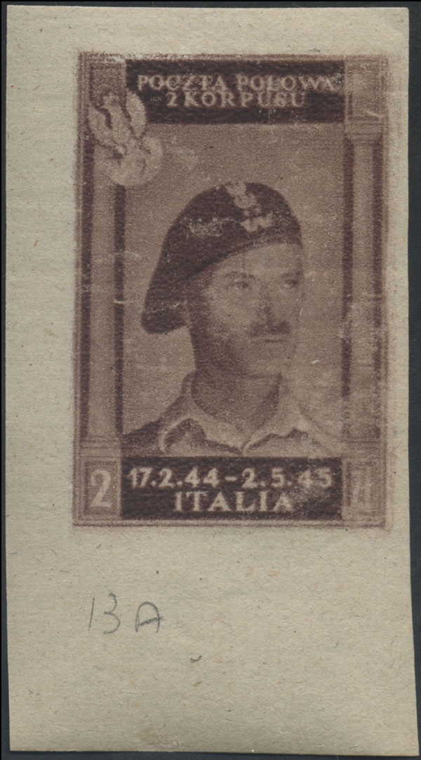 1946 poczta polowa 2. Korpusu Polskiego we Włoszech - szlak bojowy, gumowana próba w barwie brązowoliliowej na papierze y, gwarancja i oznaczenie Walocha. | Fi.4yP2nz |