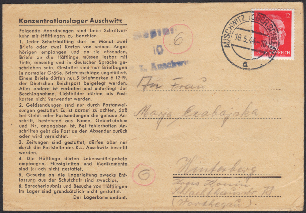 1944 Auschwitz - niemiecki obóz koncentracyjny, list z obozu koncentracyjnego na listowniku obozowym wysłany 2.06.44 do Radomia, stempel cenzora "Geprüft / 2 / A.L. Auschwitz", bardzo dobry stan zachowania. | |