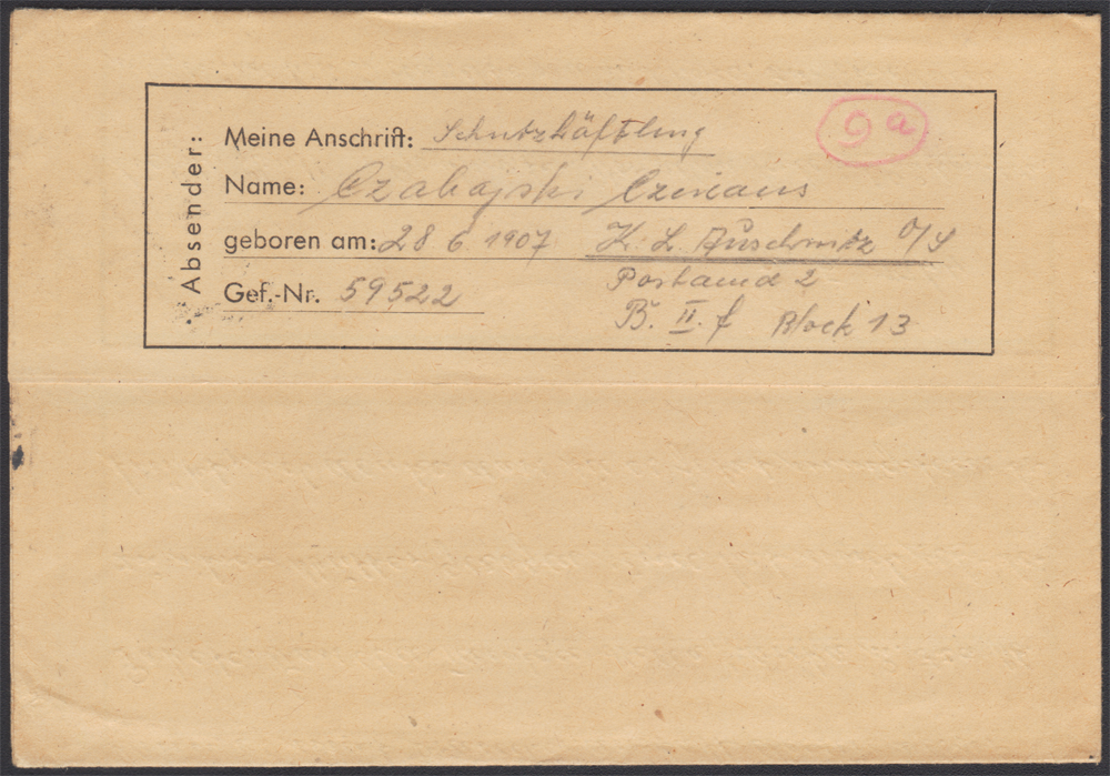 1944 KL Sachsenhausen - niemiecki obóz koncentracyjny, formularz sekretnik wysłany 29.07.44 z obozu na Pawłowic w Warthaland, stempelek cenzora z literą "A". | |