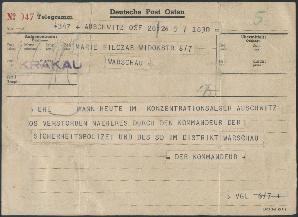 1944 Auschwitz - niemiecki obóz koncentracyjny, telegram z obozu koncentracyjnego z informacja o śmierci jeńca przekazanej przez komendanta policyjnej służby bezpieczeństwa w Warszawie do rodziny, telegram przekazany przez urząd pocztowy w Krakowie. | |