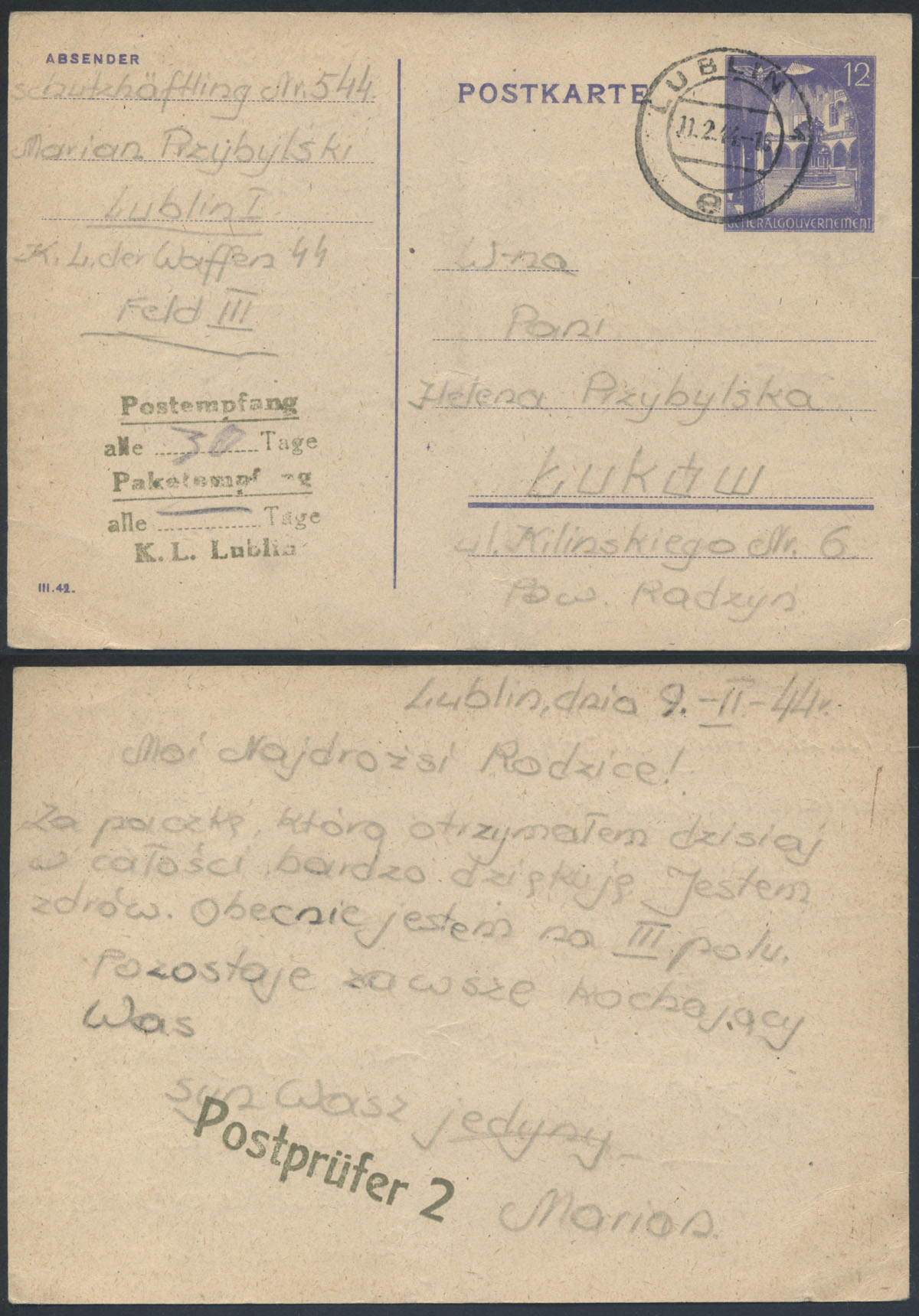 1944 Majdanek - niemiecki obóz koncentracyjny, kartka od więźnia nadana 11.02.44 do Łukowa z informacją o otrzymaniu paczki, cenzura obozu nr 2, kartka w bardzo dobrym stanie zachowania. | |