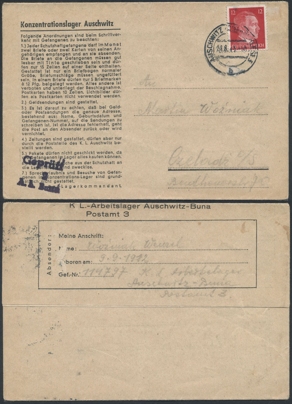 1944 Buna - podobóz niemieckiego obozu koncentracyjnego w Auschwitz, kompletny list z obozu koncentracyjnego na specjalnym listowniku obozowym obozu koncentracyjnego Auschwitz - Buna 28.8.44 do Niemiec. Buna był podobozem obozu w Auschwitz usytuowany przy fabryce gumy syntetycznej niemieckiego koncernu IG Farben gdzie kierowano do niewolniczej pracy jeńców z obozu w Auschwitz, stempel cenzora "Geprüft / 2 / A.L. Buna", bardzo rzadkie, bardzo dobry stan zachowania. | |