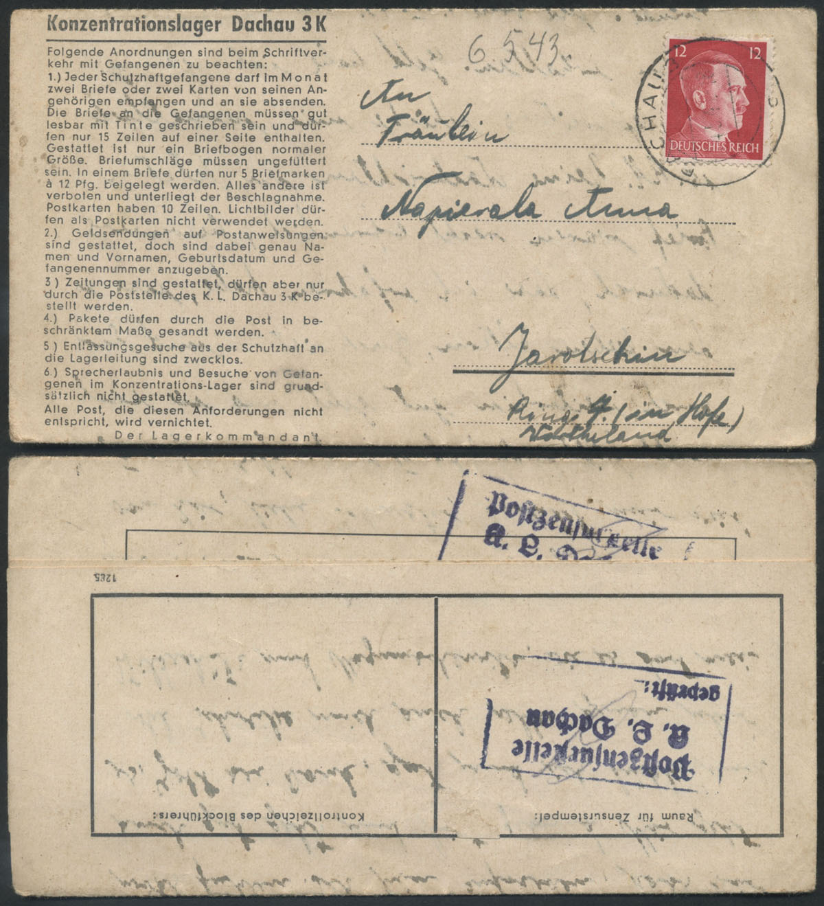 1943 Dachau - niemiecki obóz koncentracyjny, listownik wysłany 6.05.43 z obozu do Jarocina, stempelek cenzury z parafką cenzora, walor w bardzo dobrym stanie zachowania. | |