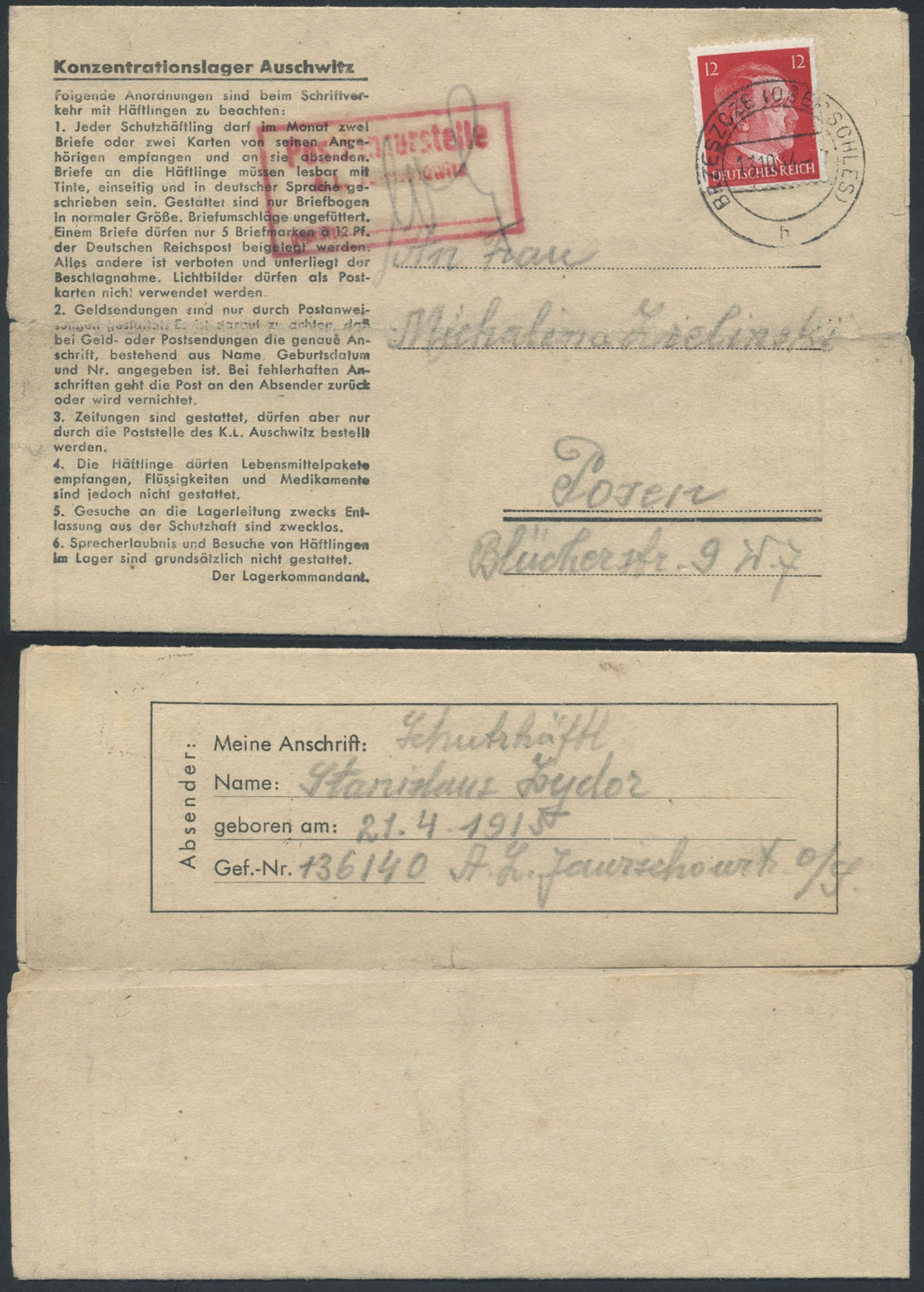 1944 Jawiszowice Brzeszcze - podobóz niemieckiego obozu koncentracyjnego w Auschwitz, list z obozu na listowniku obozowym Auschwitz wysłany 11.10.44 do Poznania, stempel cenzora, bardzo rzadkie, bardzo dobry stan zachowania. | |