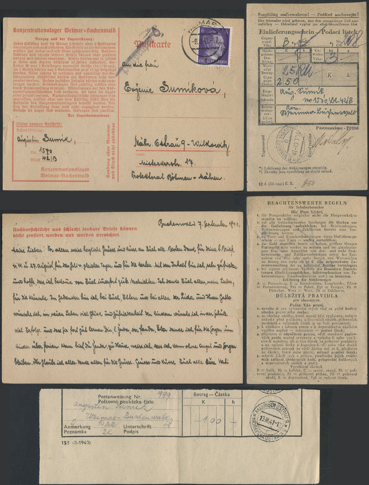 1941 Buchenwald - niemiecki obóz koncentracyjny, bardzo wczesna kartka z obozu nadana 9.09.41 na Morawy, stempel cenzora obozowego, pokwitowania przekazów pieniężnych wysłanych do osadzonego w obozie, bardzo dobry stan zachowania. | |