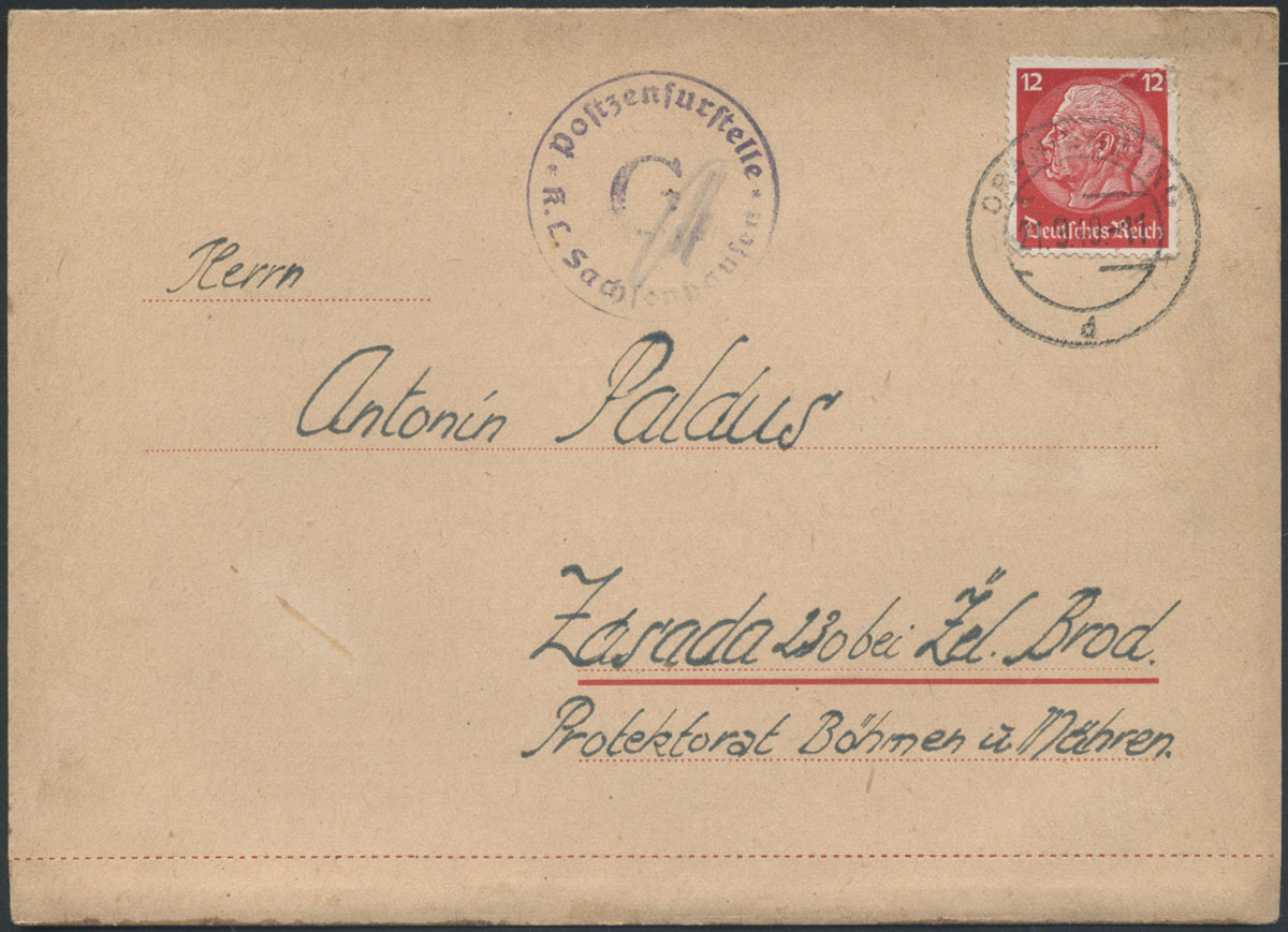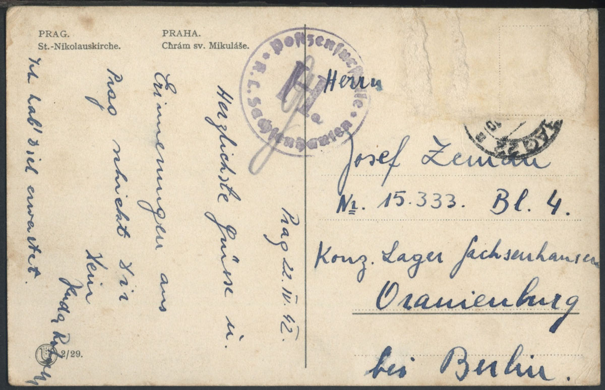 1942 KL Sachsenhausen - niemiecki obóz koncentracyjny, kartka z czeskiej Pragi wysłana do obozu, stempelek cenzora z literą "H", znaczki być może oderwane przez cenzurę w poszukiwaniu ukrytych treści, bardzo rzadko spotykana korespondencja do obozu.. | |