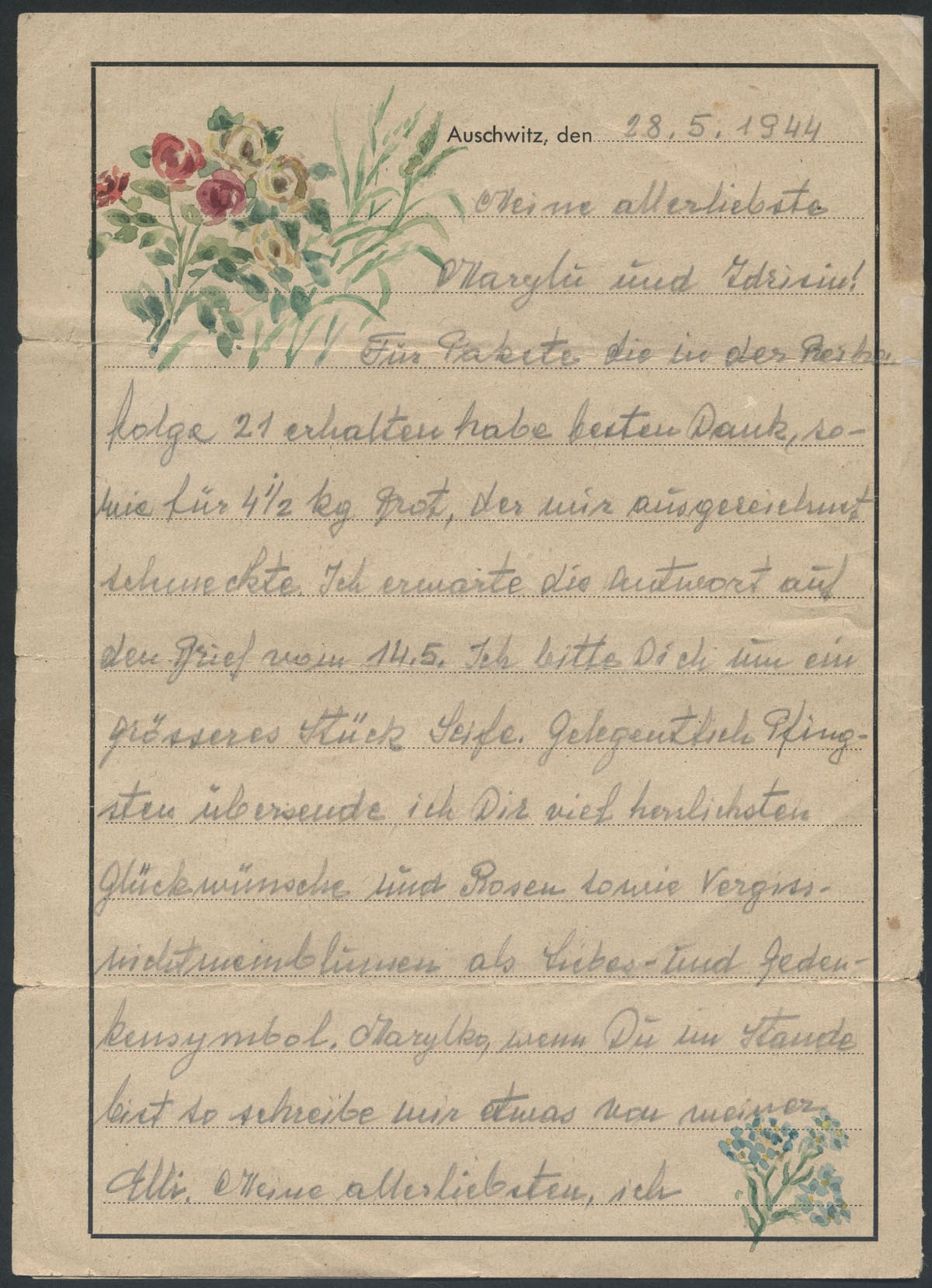 1944 Auschwitz - niemiecki obóz koncentracyjny, list z obozu z ręcznie namalowanym rysunkiem kwiatów. Robienie jakichkolwiek rysunków w listach było zabronione. Bardzo rzadko spotykany walor. | |