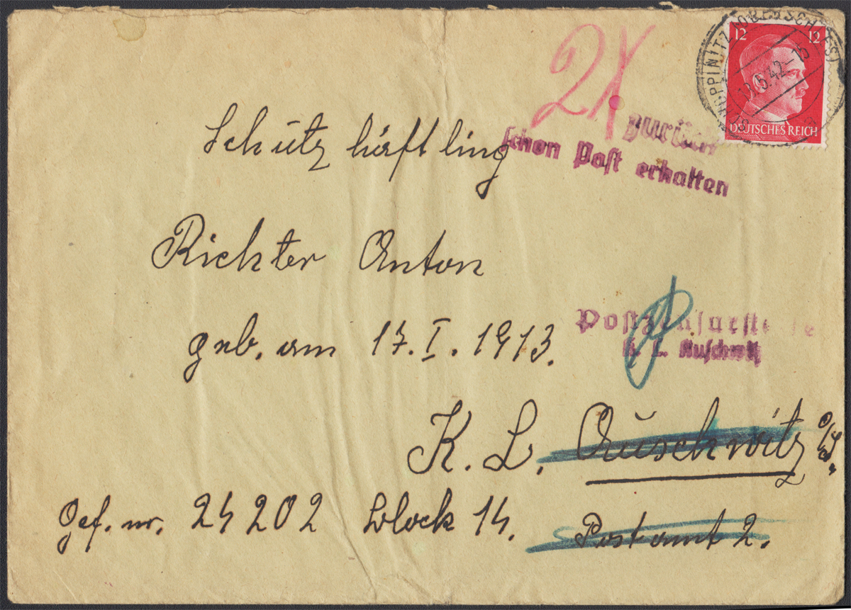 1942 AUSCHWITZ II - ZWROT DO NADAWCY, obóz koncentracyjny KL Birkenau (Auschwitz II) Oświęcim II - Brzezinka - niemiecki obóz koncentracyjny, list do obozu wysłany 18.5 z Szopienic, nie dotarł on jednak do rąk więźnia, ponieważ najpewniej otrzymał on już 2 przesyłki w tym miesiącu (na co zezwalał regulamin obozowy) - po oznaczeniu stempelkami "zurück" i "schon Post erhalten" z dopiskiem "2X" (otrzymał już dwie przesyłki) list zwrócono do nadawcy, dwuwierszowy stempel cenzury "Postzensurstelle K.L. Auschwitz " z parafką, okupacyjny datownik SCHOPPINITZ (OBERSCHLES); rzadki walor w bardzo dobrym stanie zachowania. | |