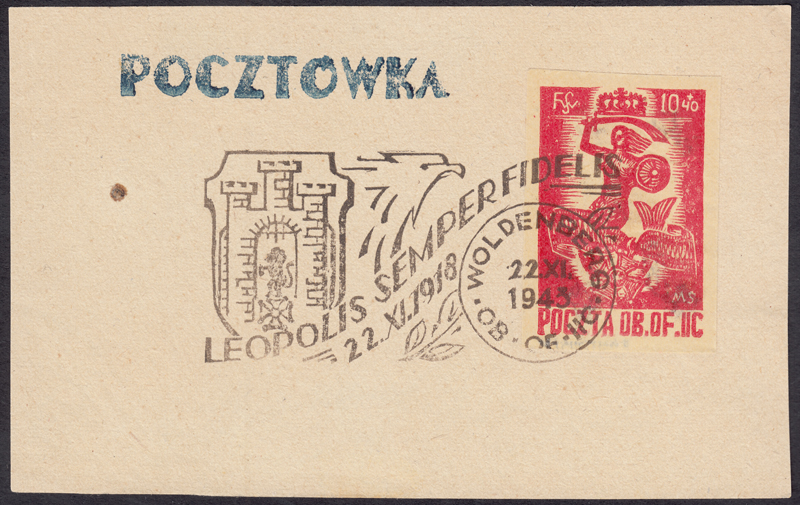 1943 znaczek na karcie ozdobionej drzeworytem autorstwa Mariana Stępnia, przedstawiającym kościół św. Anny w Warszawie skasowany stemplem okolicznościowym "LEOPOLIS SEMPER FIDELIS 22.XI.1918", gwarancja. | Fi.32 |