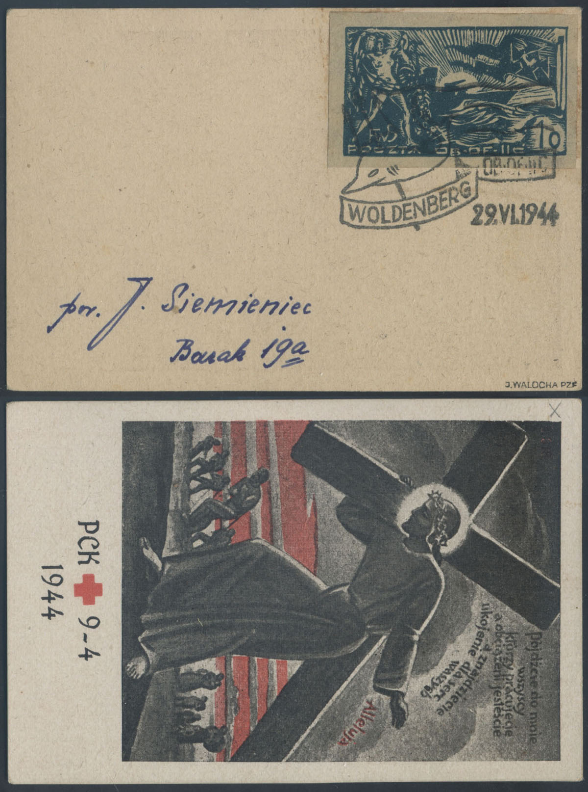 1944 wydanie obiegowe, dwa czworobloki znaczków o bardzo kontrastujących kolorach, jasny ostemplowany 4.IV kasownikiem okolicznościowym "RACŁAWICE", ciemny ostemplowany 15.X datownikiem i pocztówka ozdobiona wielkanocnym drzeworytem sygnowanym Z.S. opłacona pojedynczym znaczkiem, wysłana 7.IV, (minimalne przebarwienia); na karcie albumowej z medalowej kolekcji Øivinda Bohna z Norwegii; gwarancja. | Fi.36a, b |