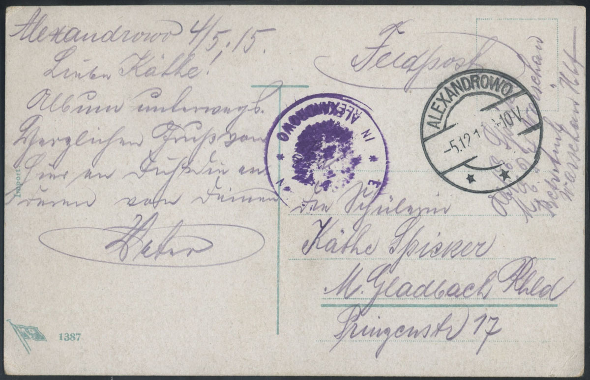 1915 kartka wysłana z Alexandrowa za pośrednictwem niemieckiej poczty polowej do Niemiec.