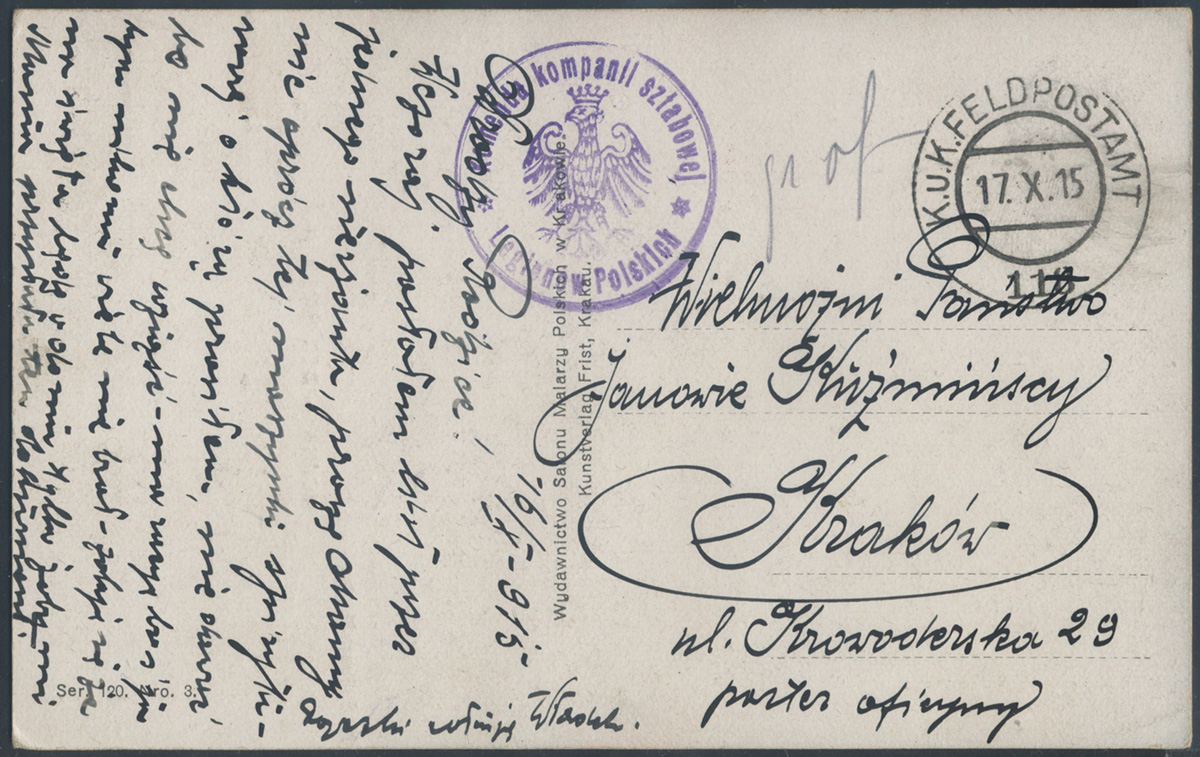 1915 kartka nadana z poczty polowej 118 do Krakowa, stempel formacyjny "Komenda kompanii sztabowej * Legionów Polskich*" z orłem legionowym.
