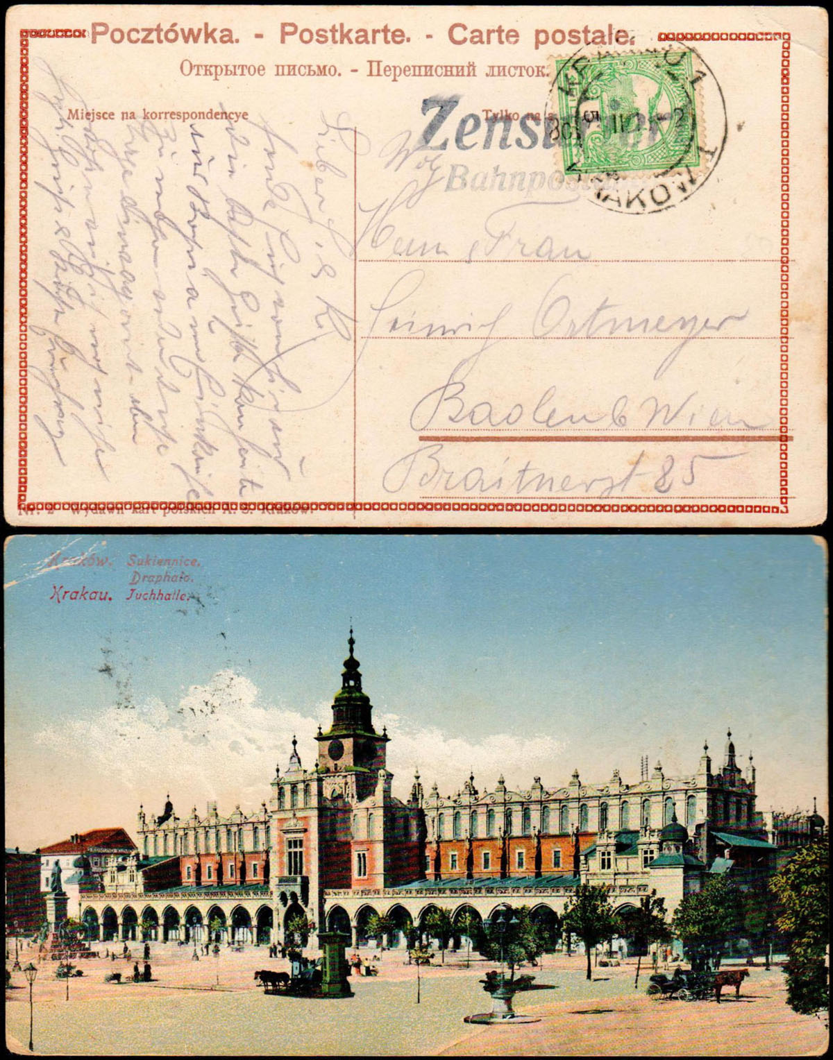 1915 użycie znaczków Węgier na terenie okupacji austro-węgierskiej, kartka wysłana 22.02.15 do Wiednia, znaczek opłaty pocztowej węgierski skasowany datownikiem KRAKAU 1 / KRAKÓW 1, stempel cenzury „Zensuriert / Bahnpostamt." Według Katalogu Specjalizowanego Znaków Pocztowych Ziem Polskich 1990 str. 500 – „znaczki Węgier wydań z lat 1913-1917 (Mi 109-207) bywały używane sporadycznie na terenie okupacji austro-węgierskiej w Polsce – cena całości pocztowej c.a.".