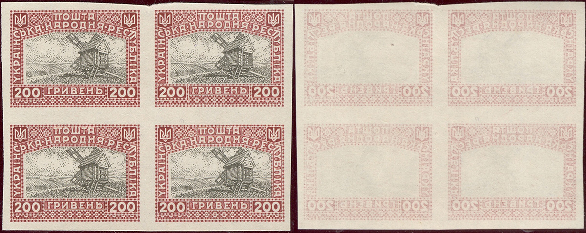 1920 Zachodnia Ukraina, czworoblok niegumowanych znaczków wydania wiedeńskiego nie wprowadzonego do obiegu, druk podwójny, a na odwrocie druk drugostronny. | Mi.V |