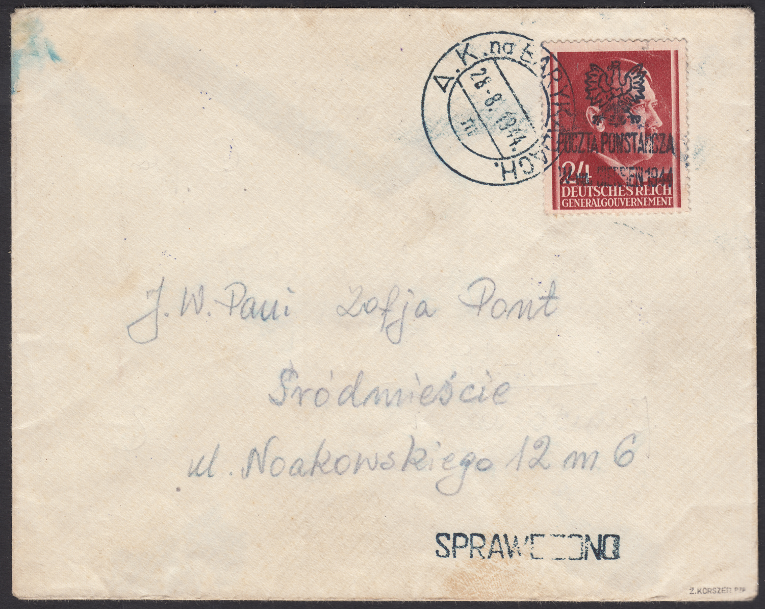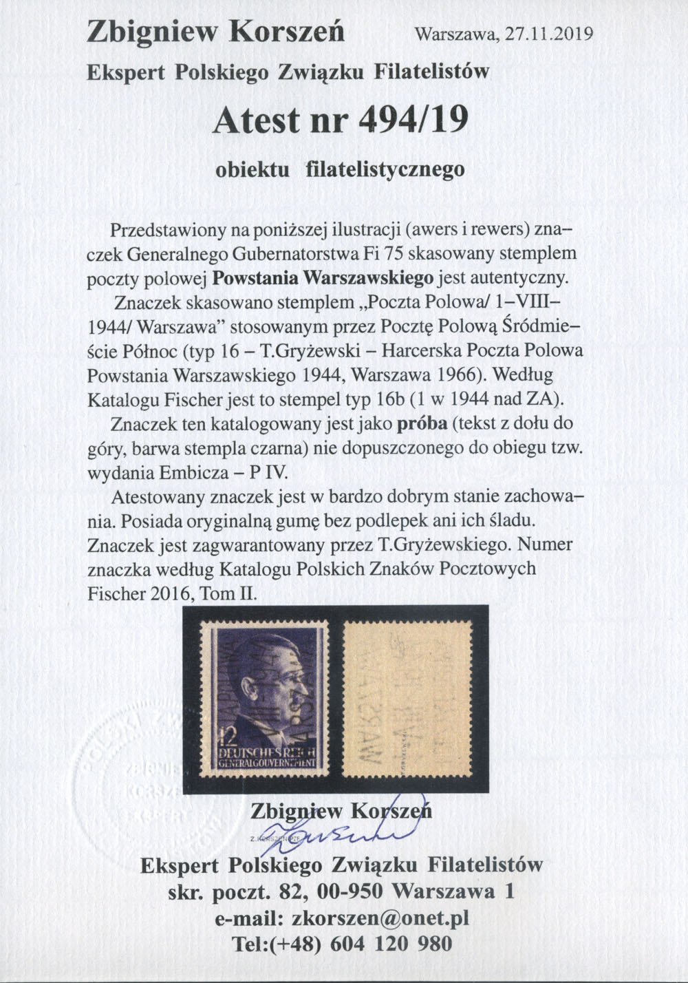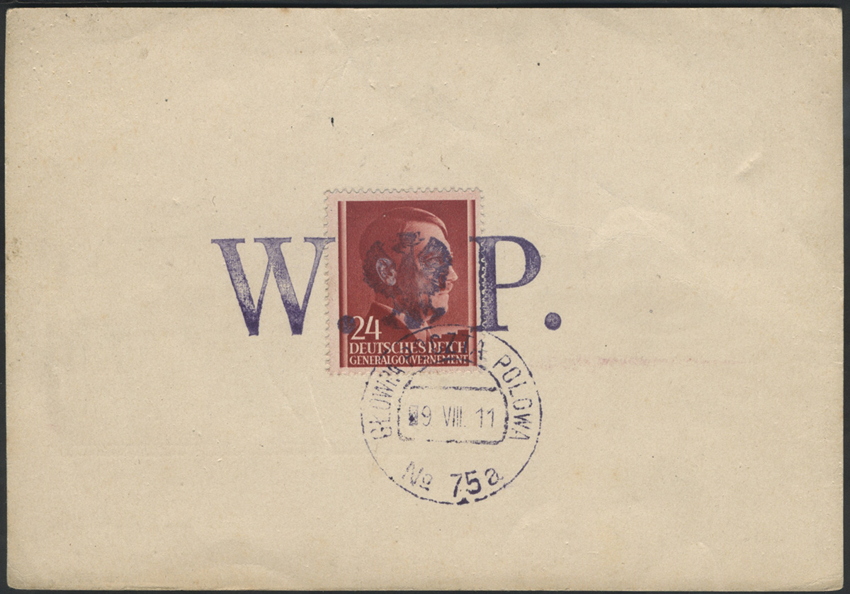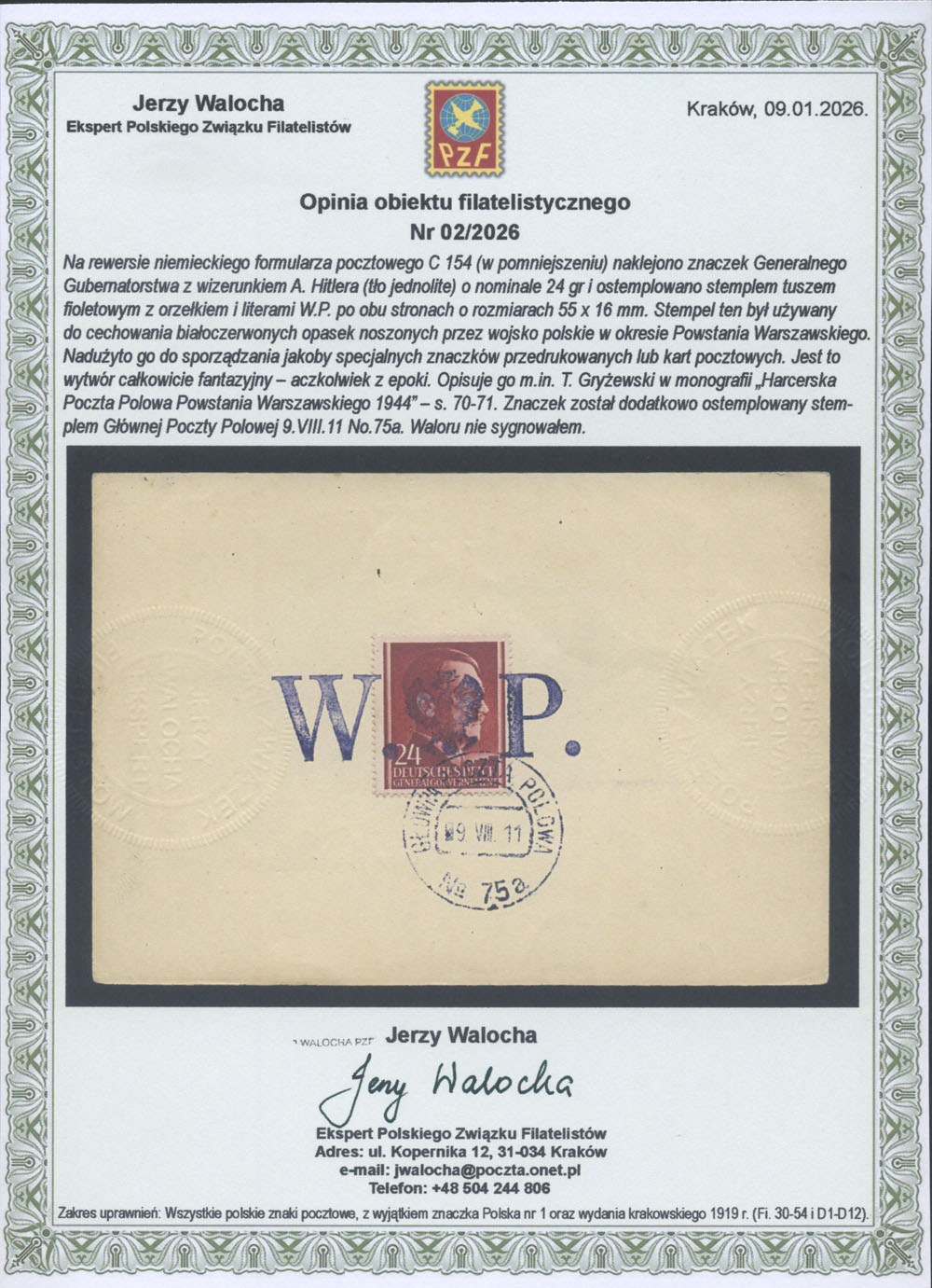 1944 GŁÓWNA POCZTA POLOWA No 75a, znaczek GG skasowany 9.VIII.44 stemplem typu 17, dodatkowo odbity stempel "W./orzeł/P.", którym cechowano biało-czerwone opaski noszone przez oddziały powstańcze, fotoatest Walocha. | |