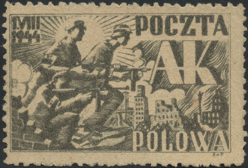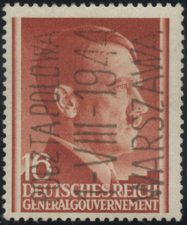 1944 Poczta Powstańcza, wydanie przedrukowe nie wprowadzone do obiegu tzw. Embicza, nadruk "POCZTA POLOWA / 1-VIII-1944 / WARSZAWA" na znaczkach GG; znaczek za 16 gr. tekst od dołu do góry - kiedyś określany jako nadruk próbny. Wskutek sprzeciwu Biura Informacji i Propagandy znaczki te nie zostały dopuszczone do obiegu, ponieważ nadruk na nich był słabo widoczny i nie zasłaniał rysunku znaczka okupacyjnego, bardzo dobry stan zachowania stan, fotoatest. | Fi.VNo |