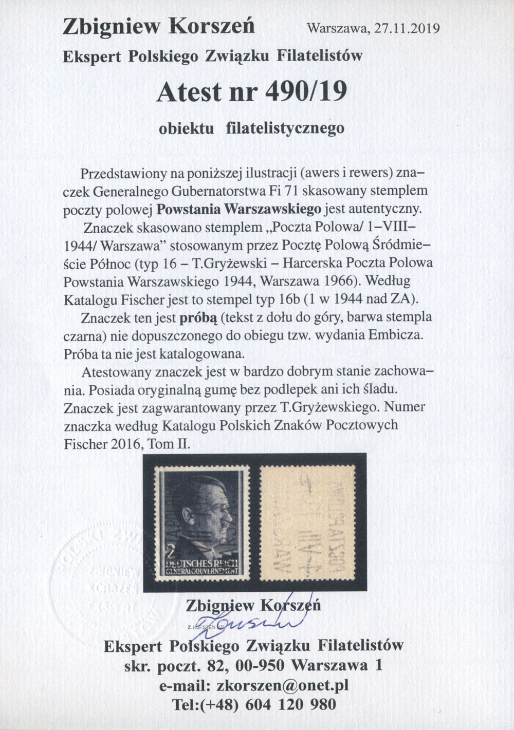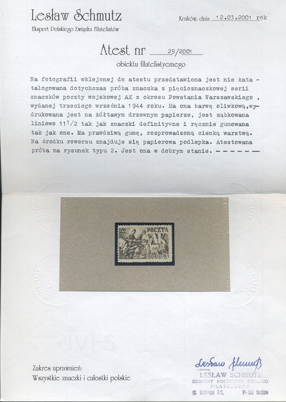 1944 Poczta Powstańcza, wydanie przedrukowe nie wprowadzone do obiegu tzw. Embicza, nadruk "POCZTA POLOWA / 1-VIII-1944 / WARSZAWA" na znaczkach GG; znaczek za 2 gr. tekst od dołu do góry - kiedyś określany jako nadruk próbny. Wskutek sprzeciwu Biura Informacji i Propagandy znaczki te nie zostały dopuszczone do obiegu, ponieważ nadruk na nich był słabo widoczny i nie zasłaniał rysunku znaczka okupacyjnego, bardzo dobry stan zachowania stan, fotoatest. | Fi.XINo |