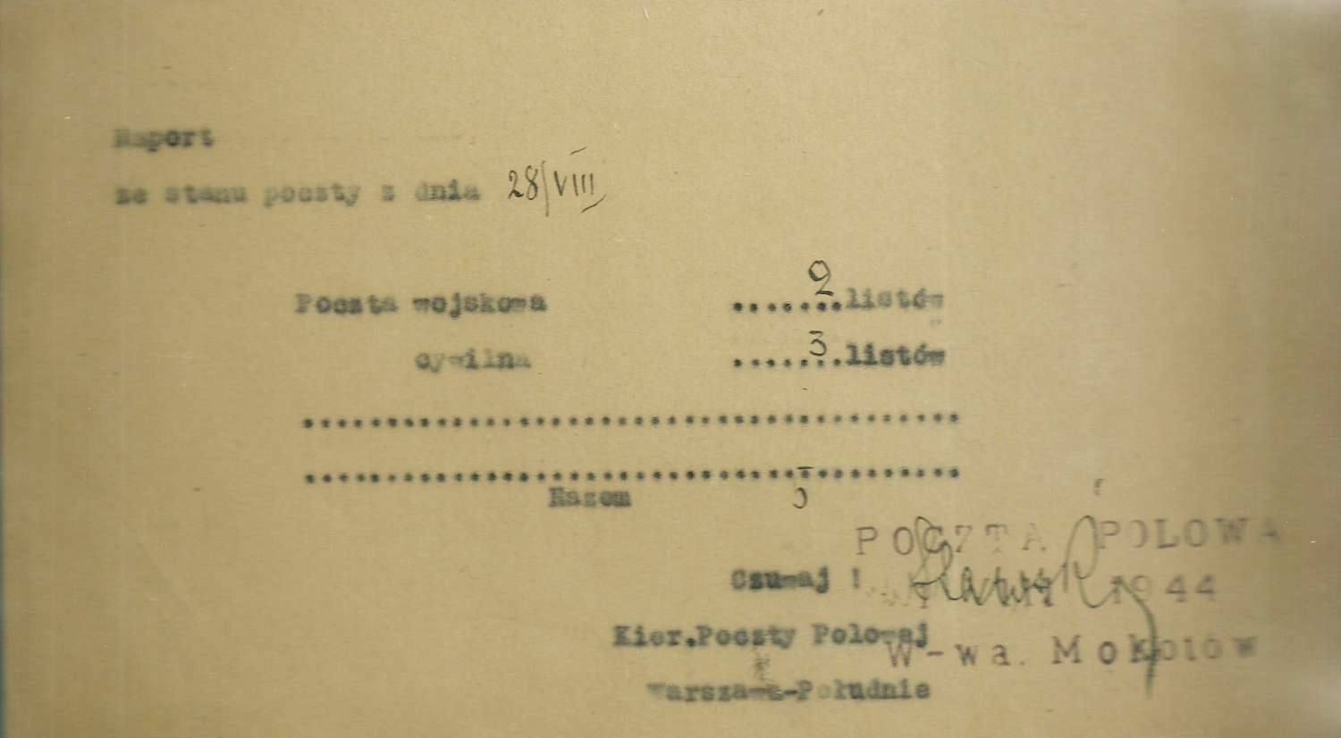 1944 przesyłka wojskowa, znaczek GG za 24 gr. wydania przedrukowego tzw. "mokotowskiego" z nadrukiem "orzełek / POCZTA POWSTAŃCZA / W-wa SIERPIEŃ 1944" unieważniony na liście kasownikiem propagandowym "AK NA BARYKADACH" z wyróżnikiem "m" (Gryżewski typ 15, Fi.+4500.-), na dole stempelek cenzury "SPRAWDZONO" (Gryżewski typ 4, Fi.+1500.-), list wysłano z urzędu Poczty Polowej AK - ekspozytura na Mokotowie w dniu 22.8.1944; nadawca "Hanka" z rejonu IV - Grupa artyleryjska „548” – „Granat”; w pierwszych dniach powstania walczyła na Polu Mokotowskim, a później wycofała się w kierunku Mokotowa Płd., list poszedł nowym szlakiem prowadzącym od włazu przy ul.Dworkowej przez kanał pod Łazienkami do Śródmieścia - właz u zbiegu Al.Ujazdowskich i Wilczej, lub na Czerniaków - właz przy Okrąg; według raportu Poczty Polowej Warszawa Mokotów - podpis Sławska, którego skan pokazujemy, tego dnia poczta na Mokotowie odprawiła 5 listów w tym 2 wojskowe; co do sposobu ofrankowania listu Gryżewski odnalazł tylko trzy podobne - "Harcerska Poczta Polowa Powstania Warszawskiego 1944" str.51, w tym jeden ofrankowany parką; listy powstańcze, które da się zidentyfikować jako przesyłki wojskowe należą do największych rzadkości zbioru Powstania Warszawskiego, gwarancja. | Fi.32 |
