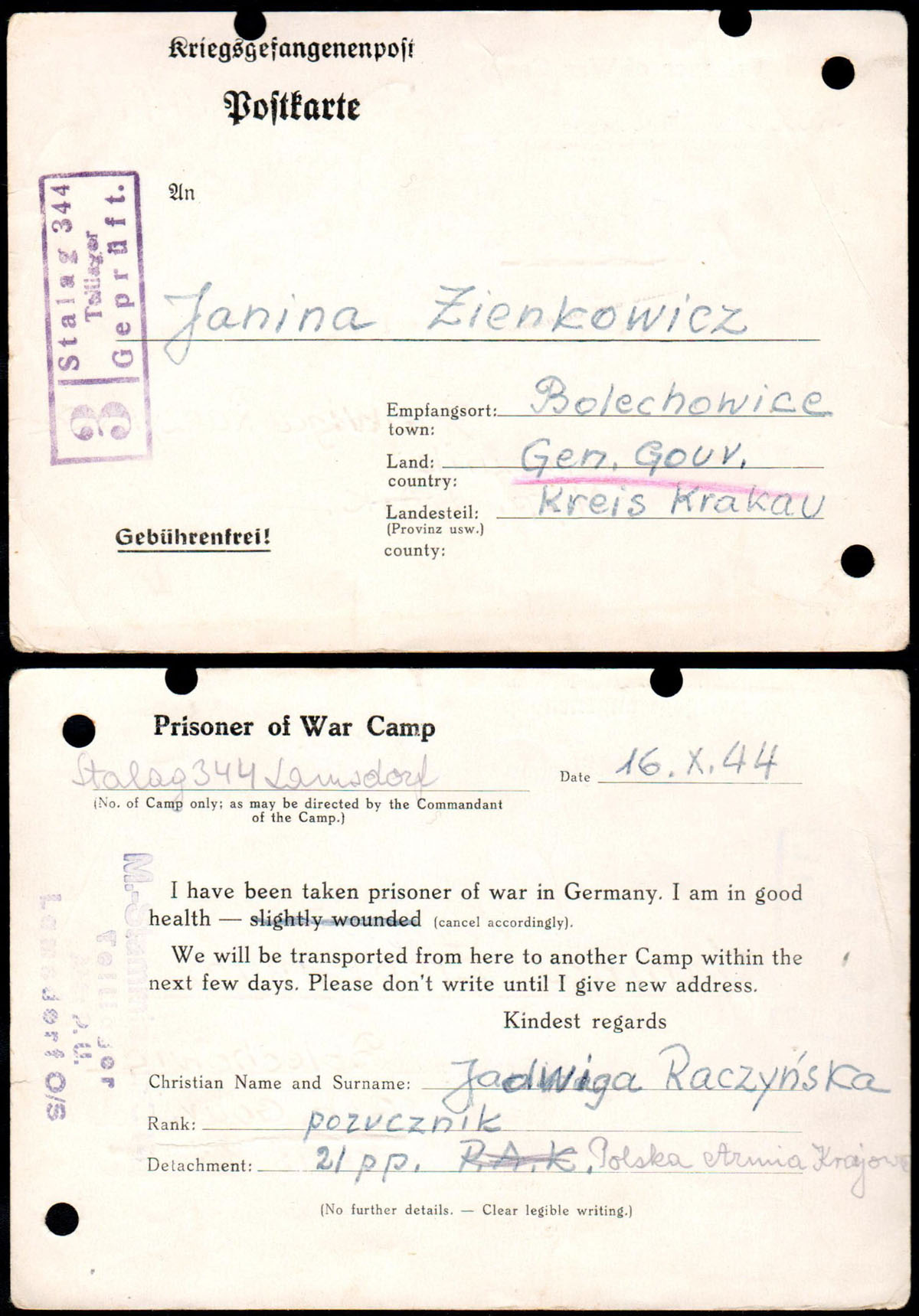 1944 Stalag 344 Lamsdorf – z Powstania Warszawskiego 1944, zawiadomienie o uwięzieniu por. Jadwigi R. z 21 pułku piechoty „Dzieci Warszawy" (Komenda Główna Armii Krajowej – Oddział VI BiP) datowane 16.10.44 (1 transport z Warszawy 6.10.44), dziurki po archiwizacji. | |