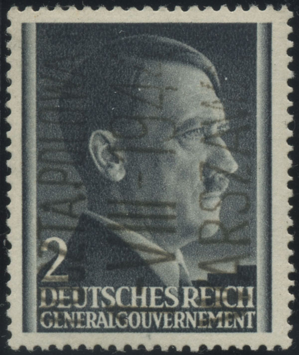 1944 wydanie przedrukowe tzw. "mokotowskie" na znaczkach GG, znaczek z serii portret Hitlera z nadrukiem "orzełek / POCZTA POWSTAŃCZA / W-wa SIERPIEŃ 1944", rzadko oferowane, gwarancja Gryżewski, Walocha. | Fi.39 |