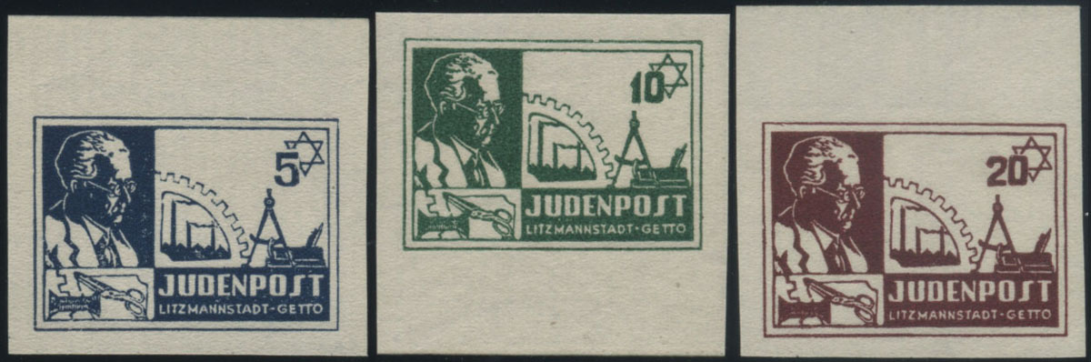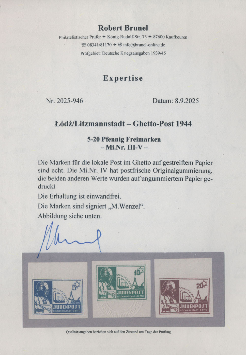 1944 Getto w Łodzi, wydanie nie dopuszczone do obiegu (tzw. wzór IV), seria czysta na prążkowanym papierze, tak jak wydano - 10 Pf. gumowany, a 5 i 20 Pf. niegumowane; znaczek gumowany z lekkim śladem podlepki (Fi.1500.-) - rabat 300.- na 5 Pf. ze słabszym narożnikiem, gwarancja. | Fi.1-3A |