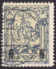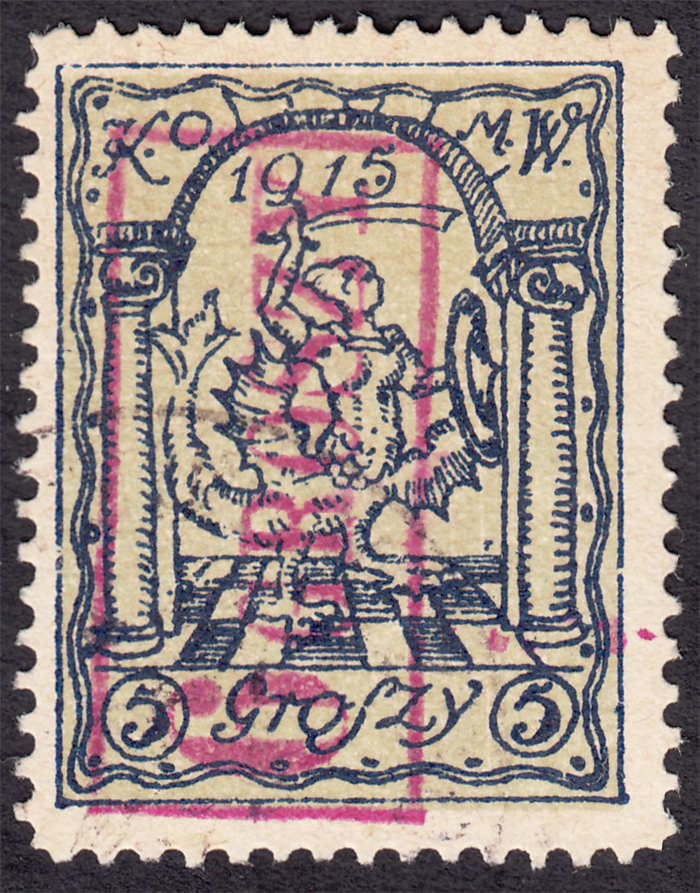 1915 Warszawa, znaczek z czytelnie odbitym obróconym o 90° ręcznym nadrukiem nowej wartości 6 GROSZY/5 gr. w kolorze fioletowym, gwarancja i oznaczenie Walocha. | Fi.4Iba Mi.4 |