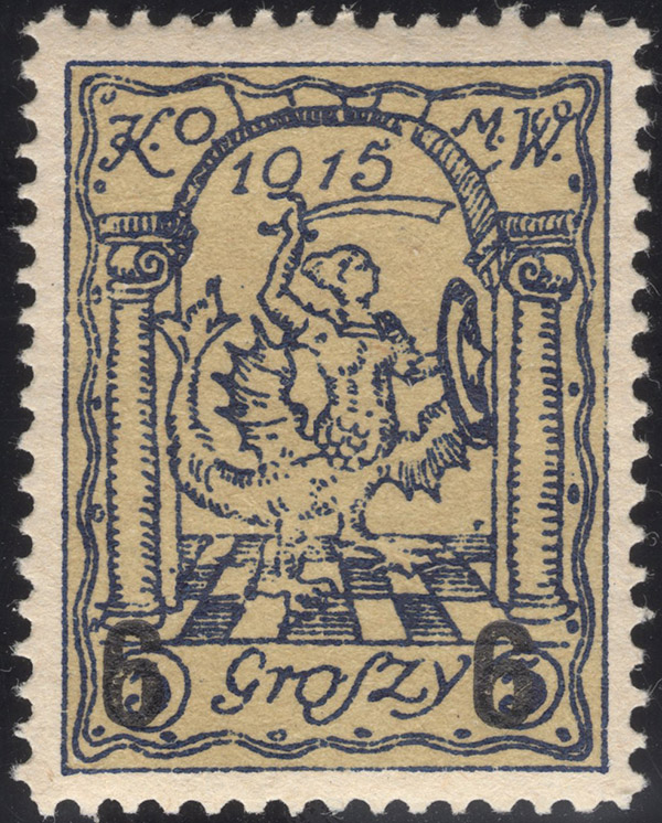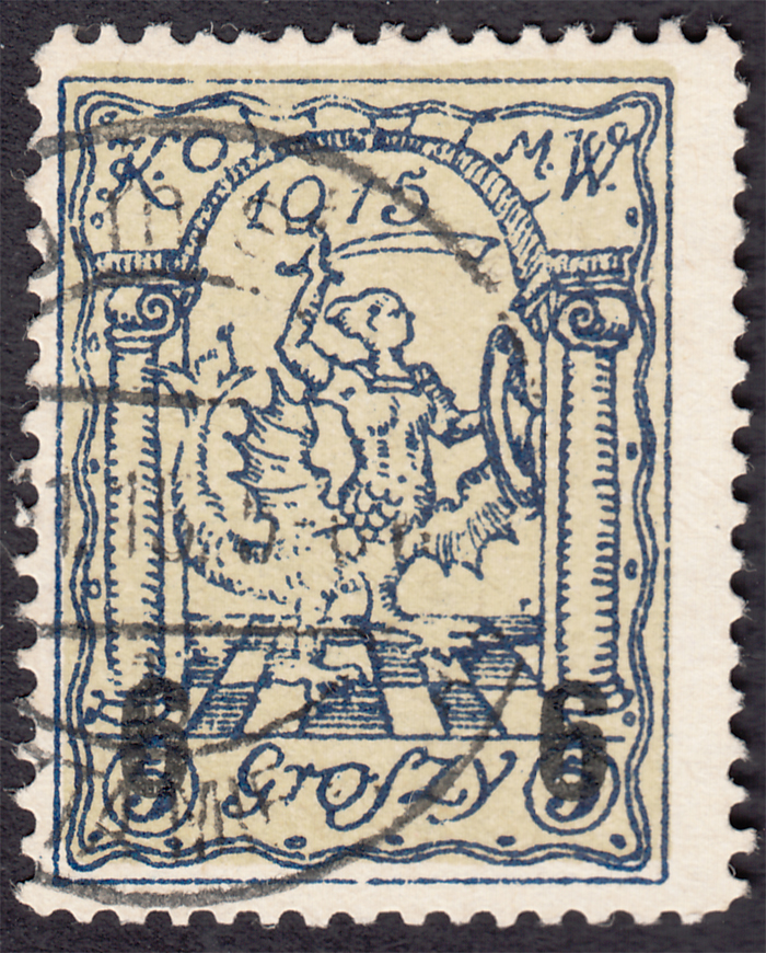 1915 Warszawa, wydanie z typograficznym nadrukiem nowej wartości 6/5 gr., nadruk nowej wartości szeroka 6 w kolorze czarnym, na znaczku podstawowym z brązowawożołtym tłem, gwarancja i oznaczenie. | Fi.5aIIf Mi.6IIab |