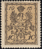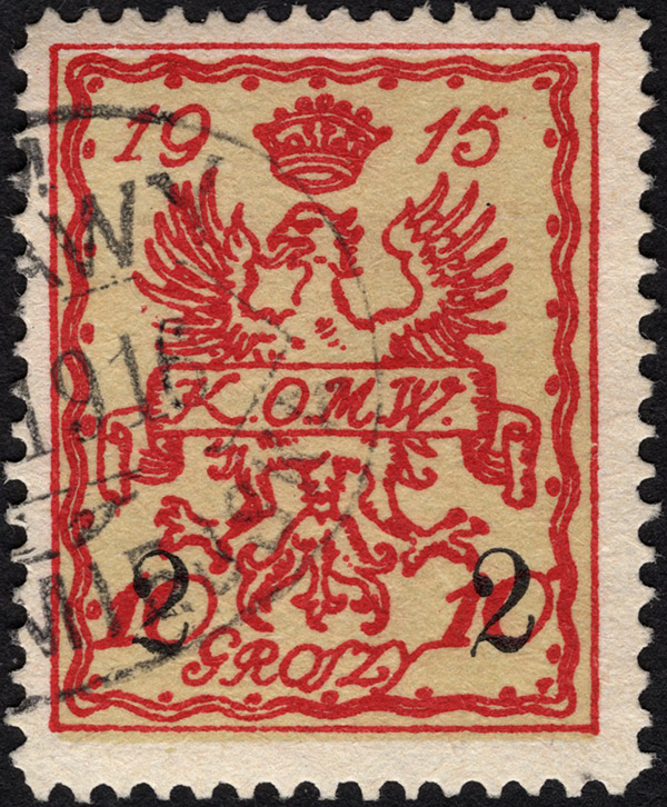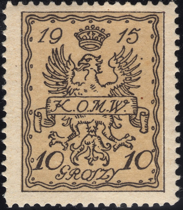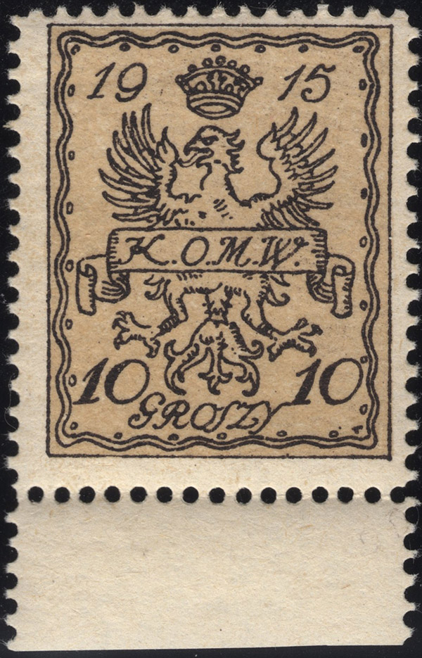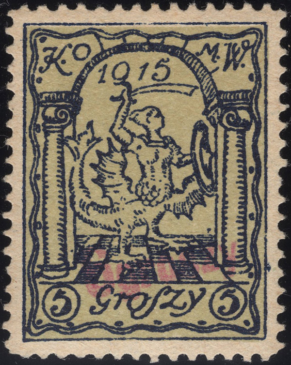 1915 Warszawa, znaczek nie wprowadzony do obiegu, charakterystyczna nierównomiernie nałożona guma, gwarancja Jungjohann. | Fi.I |