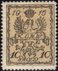 1915 Warszawa, znaczek wydania nie wprowadzonego do obiegu w barwach czarnej i tłem jasnożółtobrązowym, charakterystyczna nierównomiernie nałożona guma, gwarancja i oznaczenie Berbeka. | Fi.IIb |