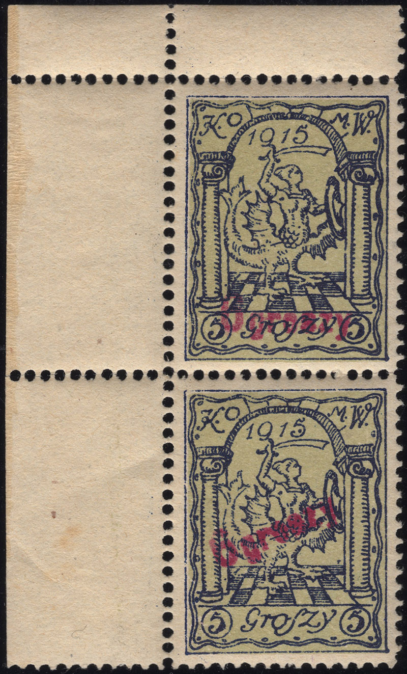 1915 Warszawa, parka znaczków wydania przedrukowego, różne typy nadruku, gwarancja i oznaczenie. | Fi.5aIIf, 5aIf |