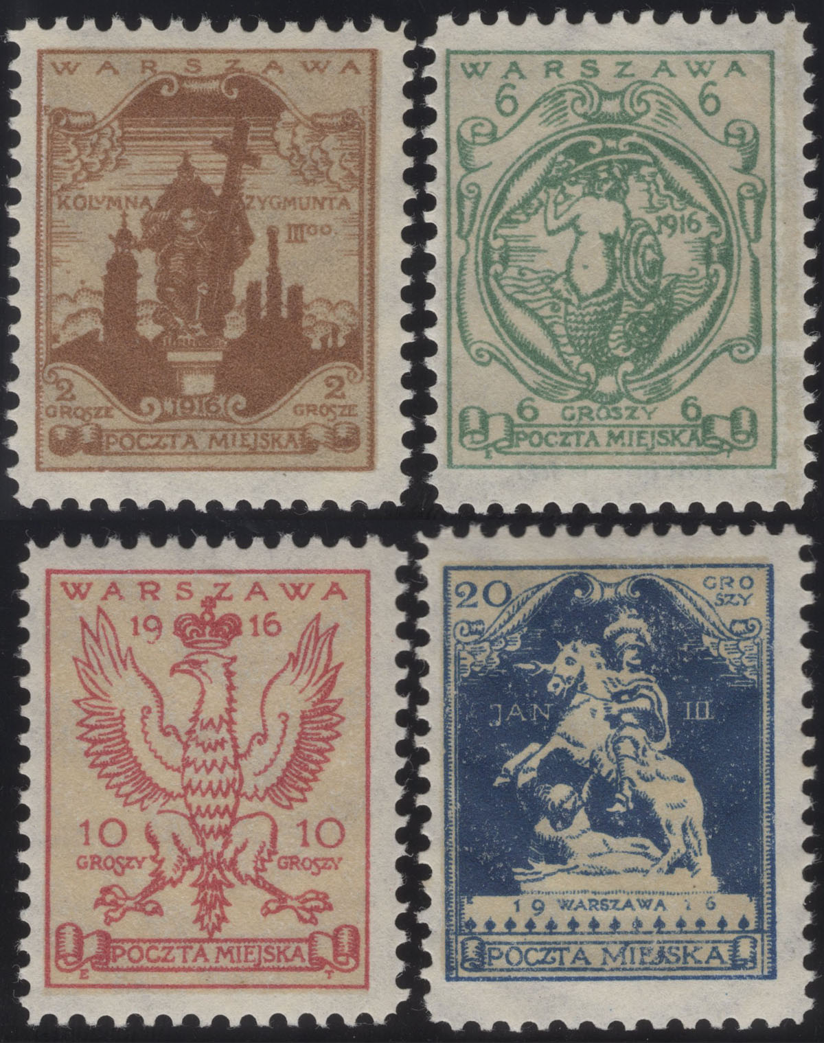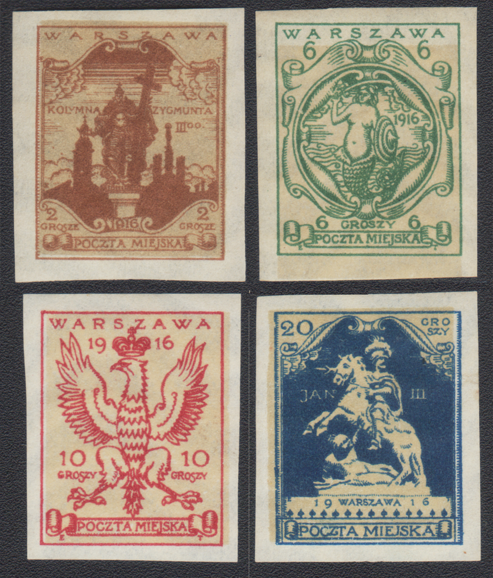 1916 Warszawa, cięta seria pomnikowa, wydanie niedopuszczone do obiegu, wszystkie znaczki z prawie niewidocznym śladem podlepki, ładny stan zachowania. | Fi.III-VIA Mi.III-VIB |