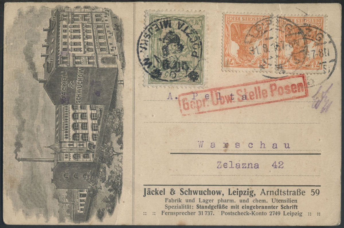 1916 Warszawa, kartka z Niemiec do Warszawy, znaczek doręczeniowy poczty miejskiej w Warszawie, stempel cenzury wojskowej w Poznaniu. | Fi.10 |