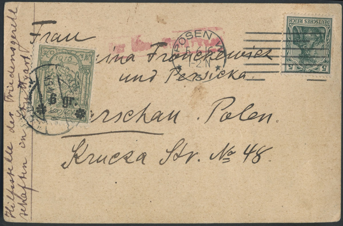 1916 Warszawa, kartka z Poznania do Warszawy, znaczek doręczeniowy poczty miejskiej w Warszawie, stempel cenzury wojskowej w Poznaniu. | Fi.10 |