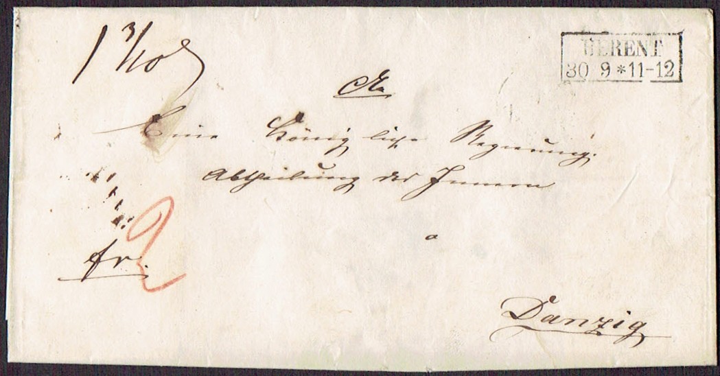 1850 po, Berent (Kościerzyna), obwoluta listu wysłanego z Kościerzyny do Gdańska. | |