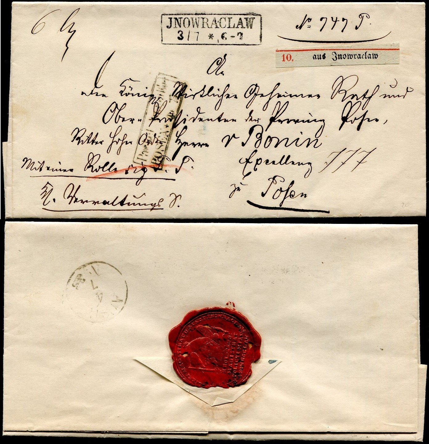 1862 Jnowraclaw (Inowrocław), list z treścią towarzyszący paczce, z tyłu bardzo dobrze odciśnięta i zachowana pieczęć lakowa Magistratu Policji i Miasta Inowrocławia. | |