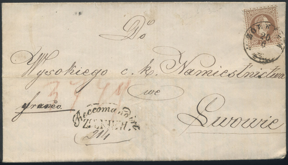 1870 kompletny składany list polecony z Żółkwi do Lwowa, rzadki stempel polecenia z Żółkwi, na odwrocie stempel odbiorczy. | Mi.39 |