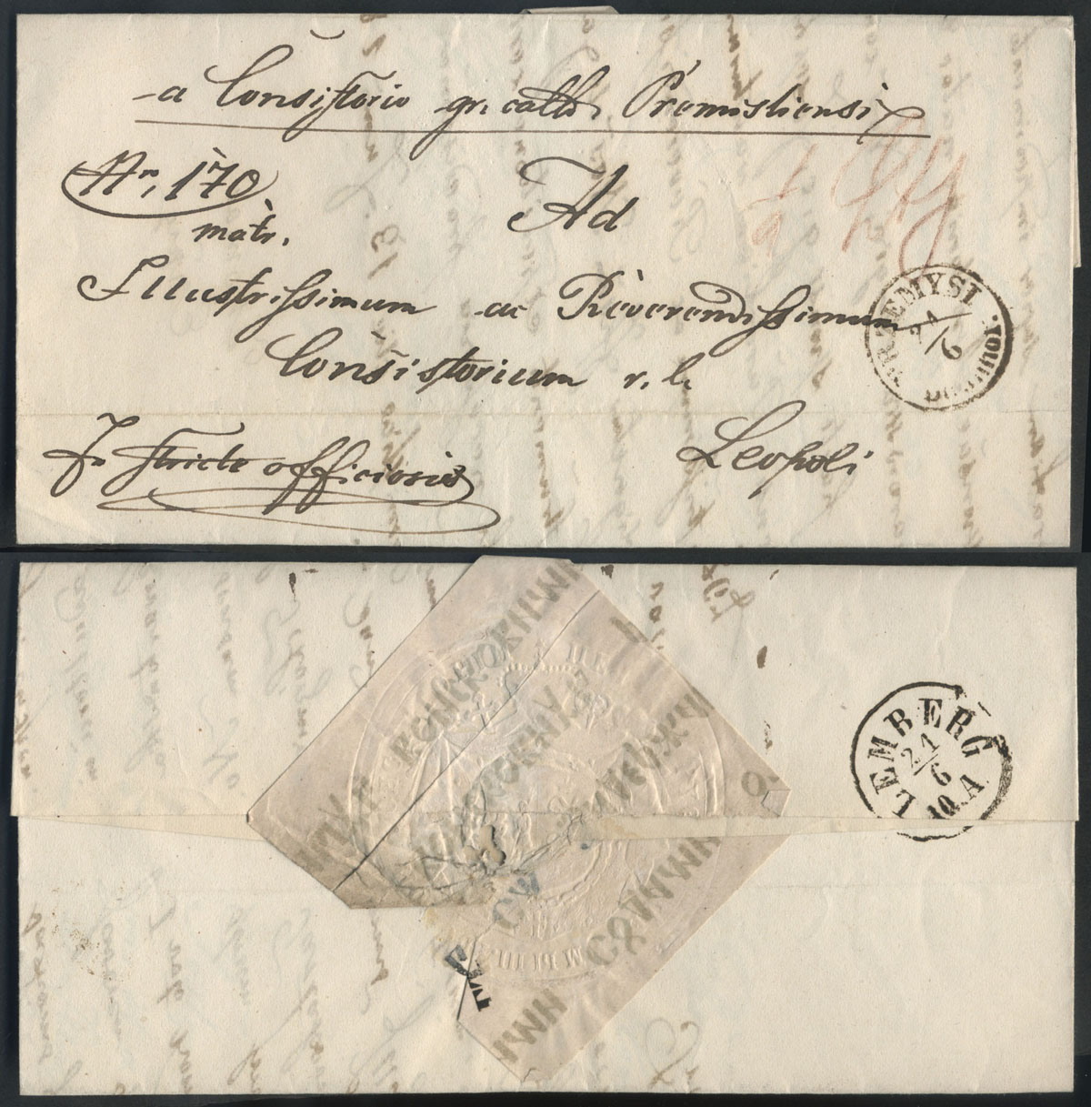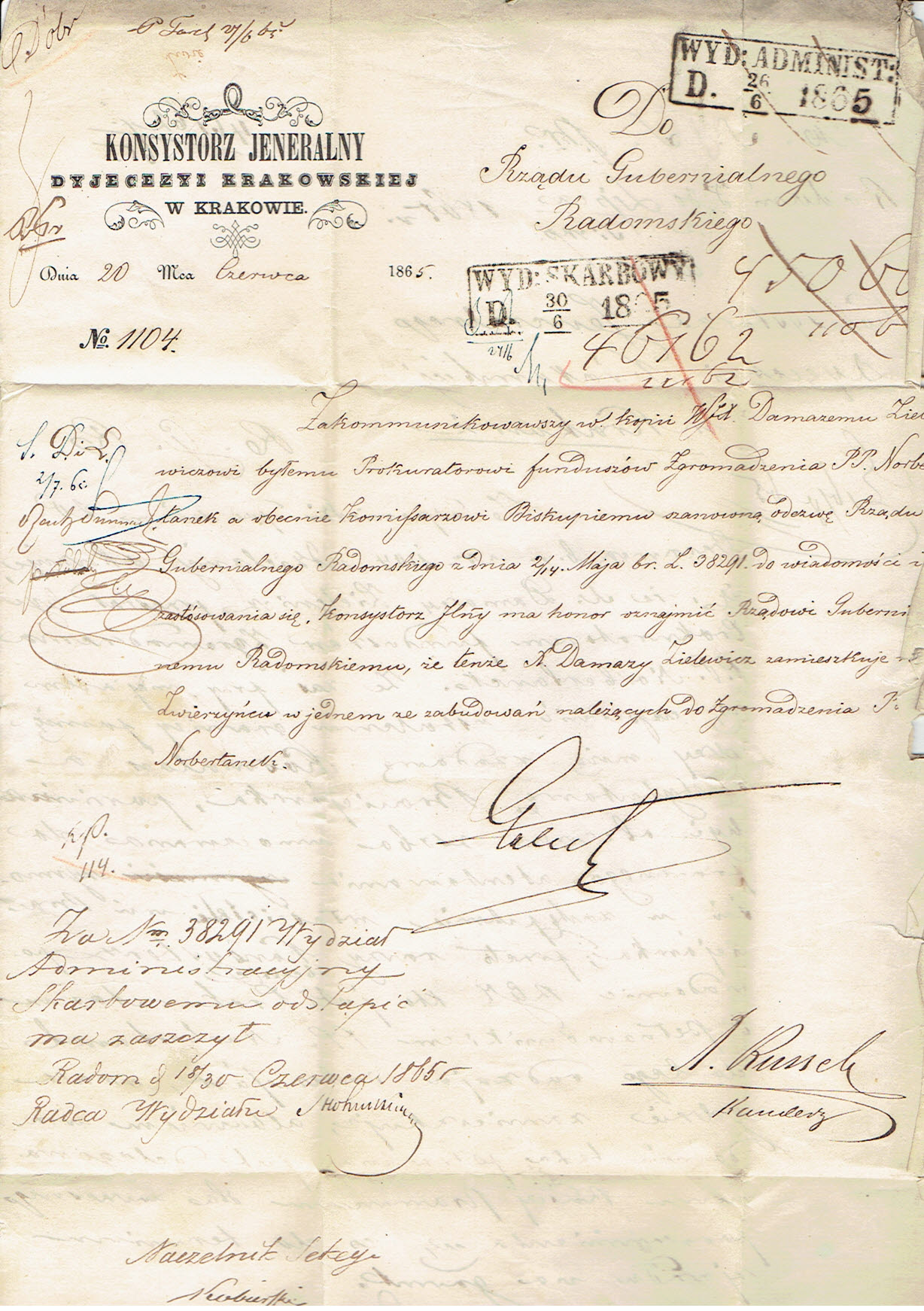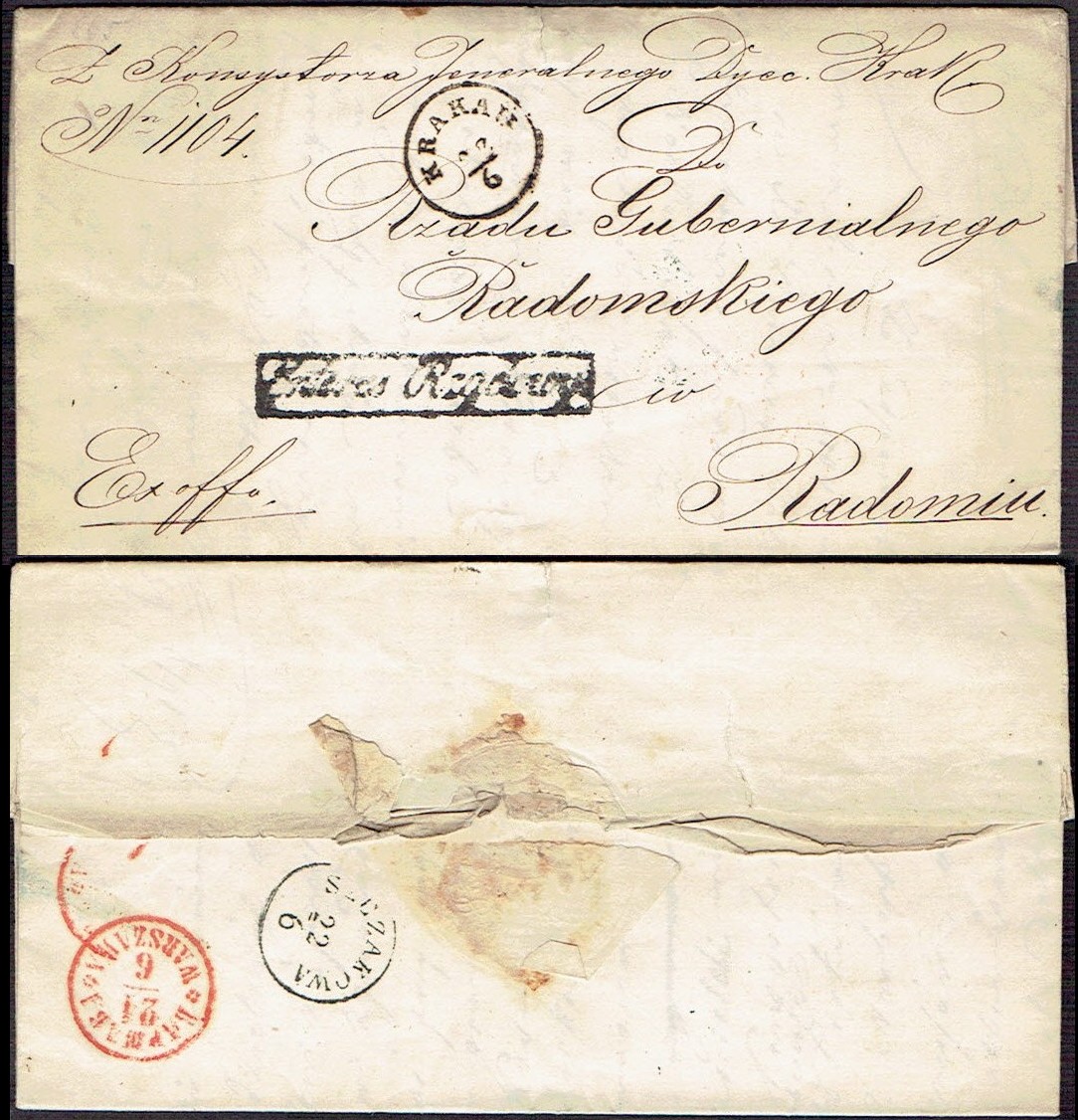 1865 Krakau, kompletny list składany wysłany 22.6.1865 przez Konsystorza Jeneralnego Dyjecezyi Krakowskiej do Radomia, stempel nadawczy typu IIIC, datowniki tranzytowe Szczakowej i Warszawy, dodatkowo stempelek "Interes Rządowy" oznaczający, że list jest zwolniony z opłaty pocztowej, treść listu napisana na papierze firmowym. | |