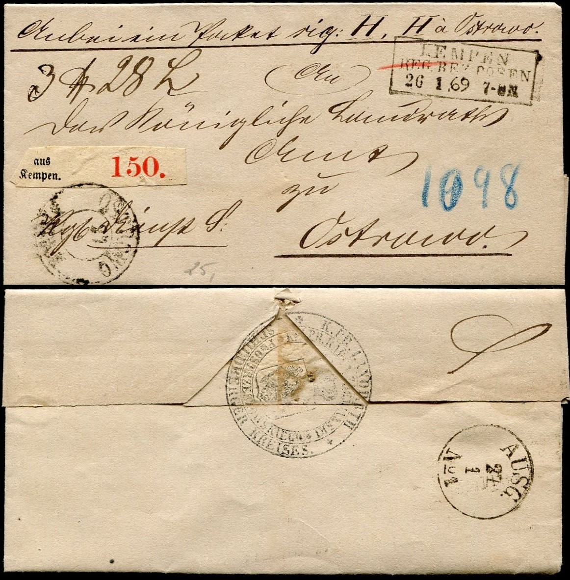 1869 Kempen (Kępno), list z treścią towarzyszący paczce, z tyłu ładnie odbita pieczęć tuszowa. | |