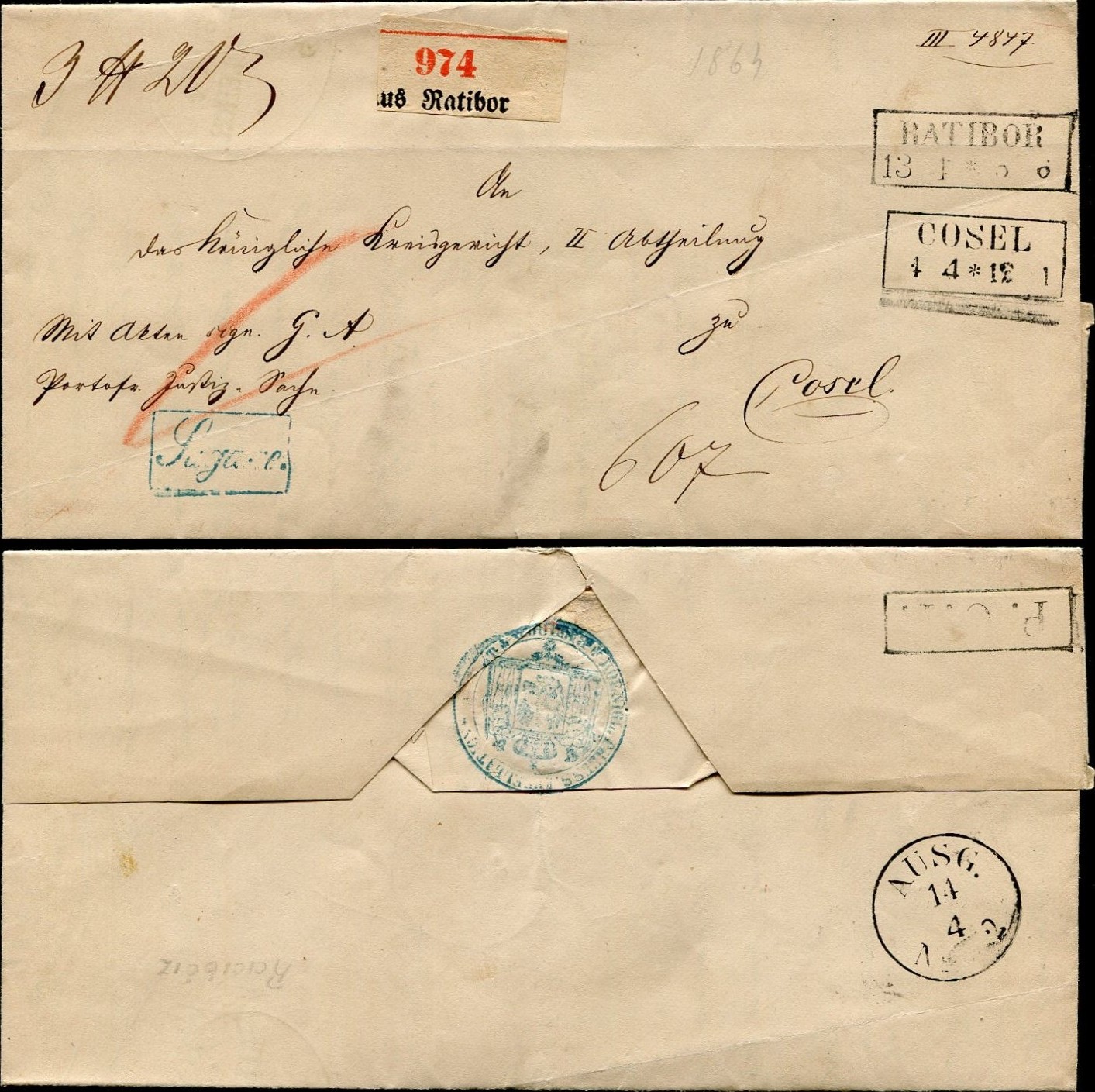 1864 Ratibor (Racibórz), list z treścią towarzyszący paczce wysłanej do Cosel (Koźle). | |